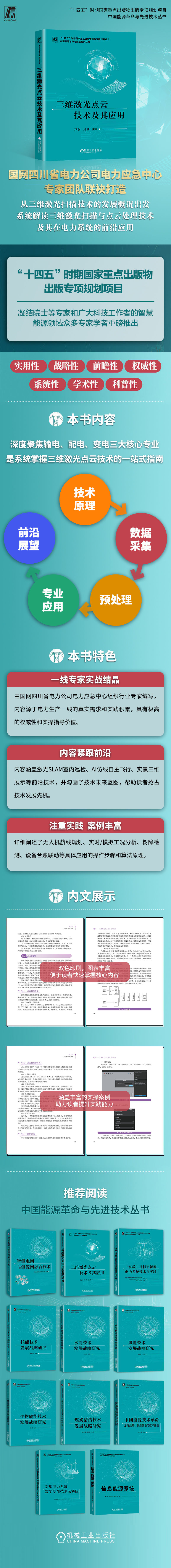 本书从三维激光扫描技术的发展概况出发,介绍了三维激光扫描系统的分类,分析了三维激光点云技术存在的问题和发展趋势,对三维激光扫描点云数据采集技术、点云数据预处理进行了全面的解析,从输电、配电、变电三个专业系统梳理了点云数据处理与应用的要点与过程,并收集总结了相关前沿技术。全书既有理论高度,又有实践深度,能够使读者全面了解这项技术的核心优势及其在不同场景中的应用。
