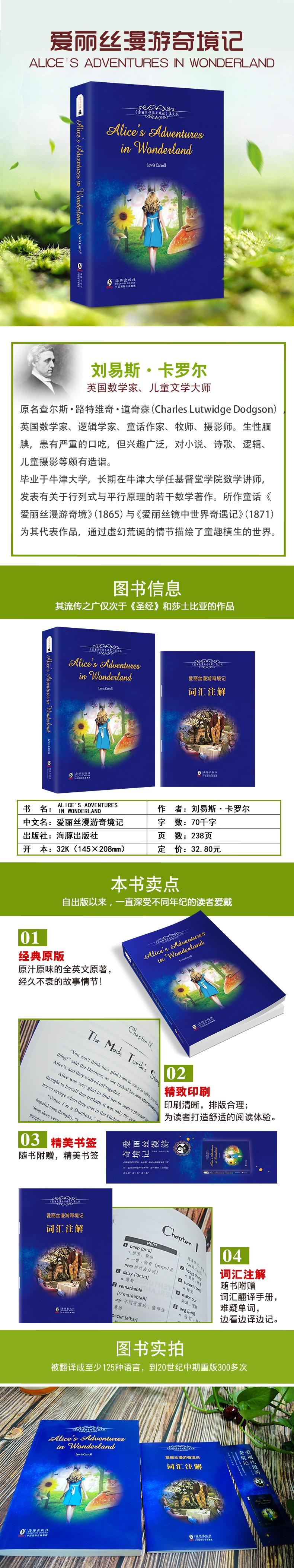 《爱丽丝漫游奇境记》讲述了小姑娘爱丽丝追赶一只揣着怀表、会说话的白兔,掉进了一个兔子洞,由此坠入了神奇的地下世界。在这个世界里,喝一口水就能缩得如同老鼠大小,吃一块蛋糕又会变成巨人,在这个世界里,似乎所有吃的东西都有古怪。她还遇到了一大堆人和动物:渡渡鸟、蜥蜴比尔、柴郡猫、疯帽匠、三月野兔、睡鼠、素甲鱼、鹰头狮、丑陋的公爵夫人。兔子洞里还另有乾坤,她在一扇小门后的大花园里遇到了一整副的扑克牌,牌里粗暴的红桃王后、老好人红桃国王和神气活现的红桃杰克(J)等等。在这个奇幻疯狂的世界里,似乎只有爱丽丝是仅有清醒的人,她不断探险,同时又不断追问“我是谁”,在探险的同时不断认识自我,不断成长,终于成长为一个“大”姑娘的时候,猛然惊醒,才发现原来这一切都是自己的一个梦境。
