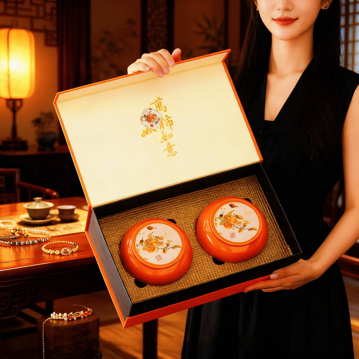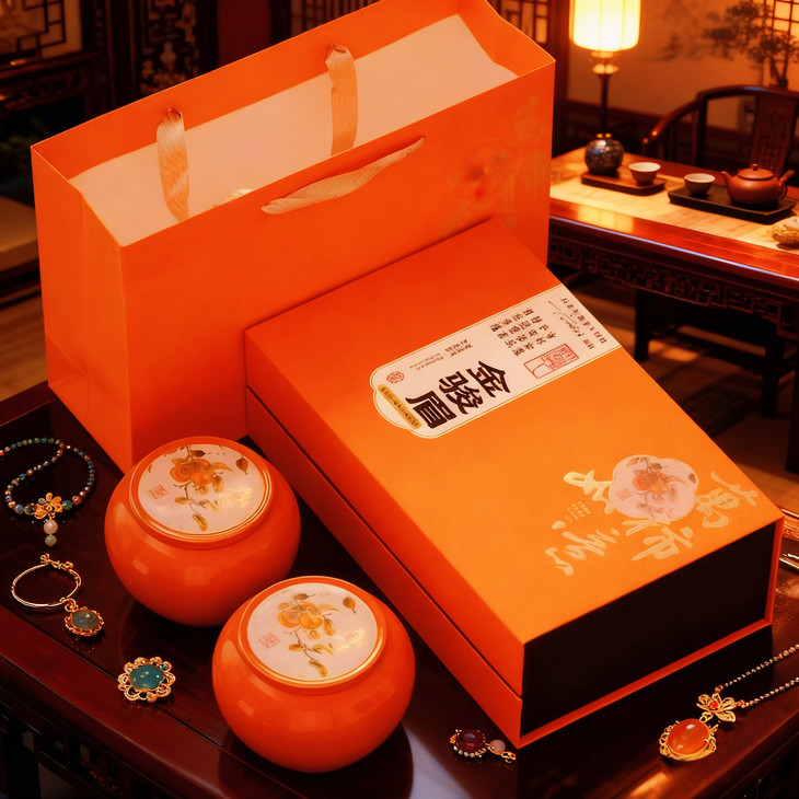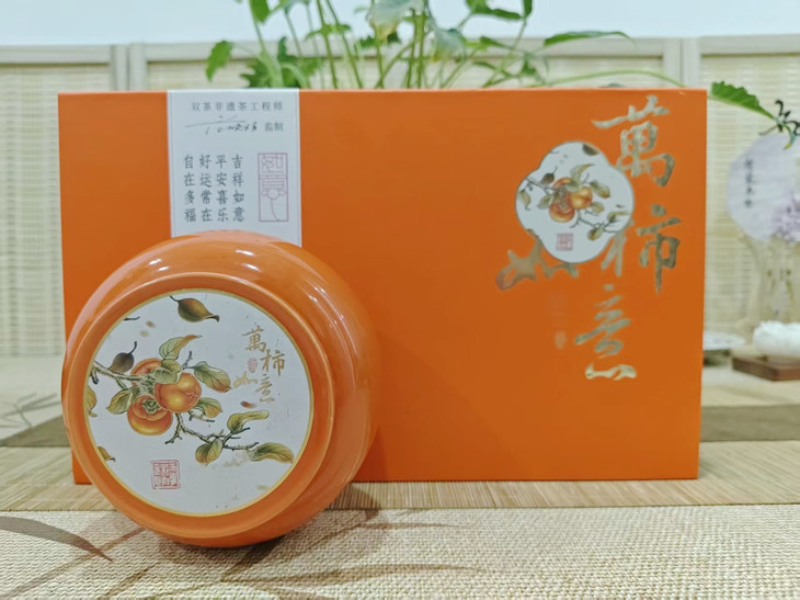 ✅再看它:这包装,拿出来就赢了 谁能拒绝 “好看又有寓意” 的茶礼啊! 这盒「萬柿如意」,光是颜值就能让收到的人眼睛发亮 罐:是茶罐,更是摆件,暖橘色的陶瓷罐,釉面亮得像打了柔光,握在手里沉甸甸的很有质感; 罐身:印着工笔手绘的 “柿子图”—— 饱满的橙红柿子挂在枝桠上,连叶脉都画得清清楚楚,谐音 “事事如意”,往茶桌、书柜上一摆,中式氛围感直接拉满,喝完茶罐子还能留着装茶叶、放小物件。 盒:打开的瞬间,仪式感拉满,外层是哑光橘红礼盒,烫金 “萬柿如意” 四个字大气又雅致;一打开盒盖,竹纹内衬裹着两个瓷罐,衬得暖橘色更温柔,连盒盖内侧都印着同款柿子图案,细节里全是用心 —— 不管送长辈、客户,还是给闺蜜当伴手礼,对方接过去的那一刻,肯定会笑着说 “这礼物也太会了吧”! 量:双罐 250g,够喝一整个秋冬一盒里装着两个瓷罐,每罐 125g,总共 250g,够你从深秋喝到暖春,自饮能喝出仪式感,送礼也够实在不 “小气”。