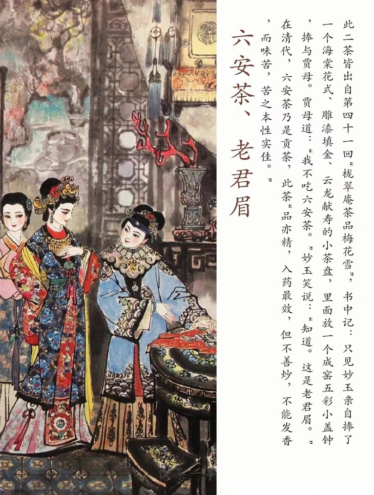 金骏眉的典故承袭自中国古典文学巨著《红楼梦》,被誉为“梦幻之茶” 《红楼梦》中的贾母就喜好老君眉,也就是现在大家所知的金骏眉。