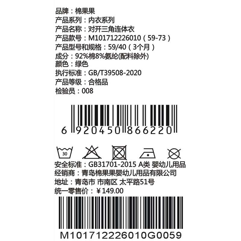 棉果果春季新品男宝女宝立体图案5A抗菌纯棉三角爬服5A抗菌纯棉对开三角连体衣M101712226010