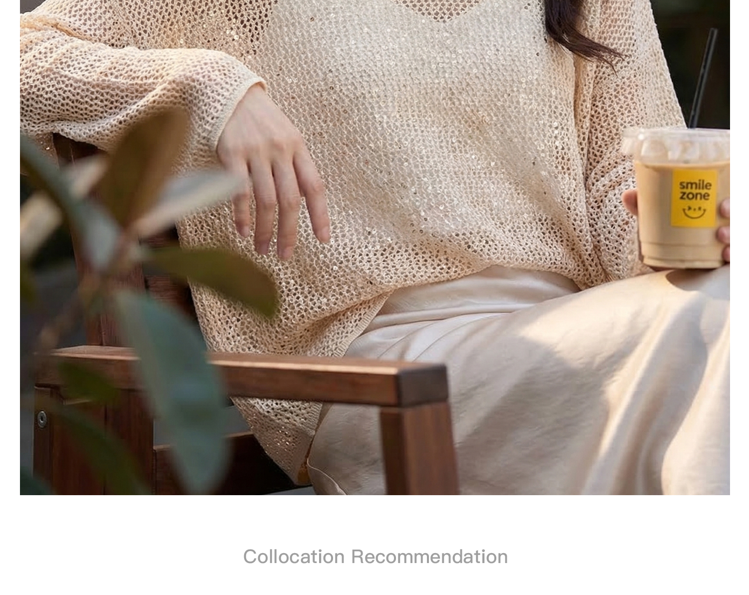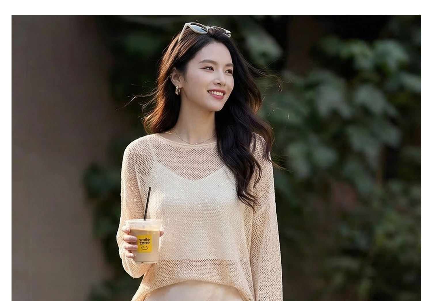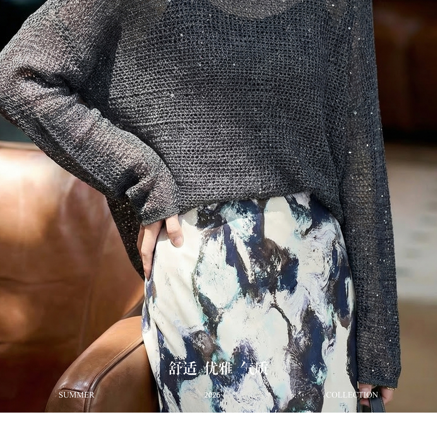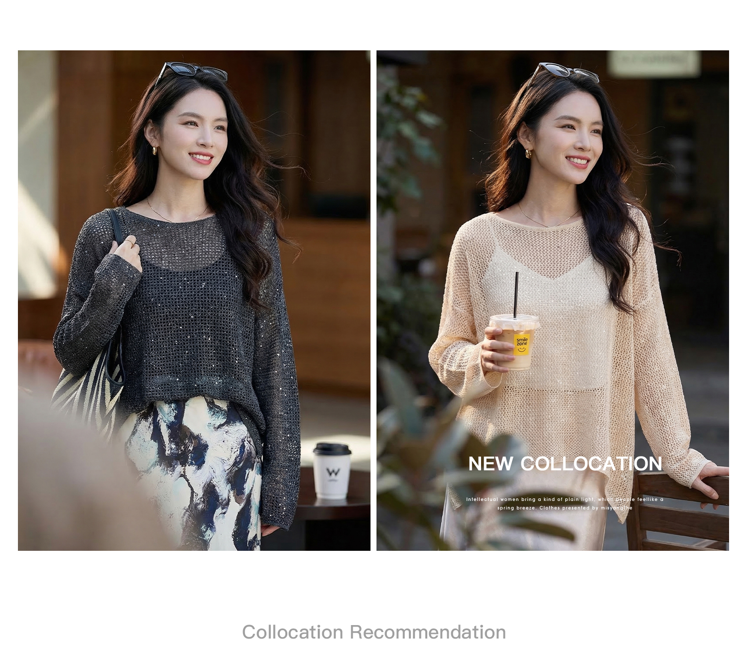 慵懒镂空针织罩衫 米思阳2026夏季新款圆领透视宽松薄款长袖防晒度假针织衫女1172