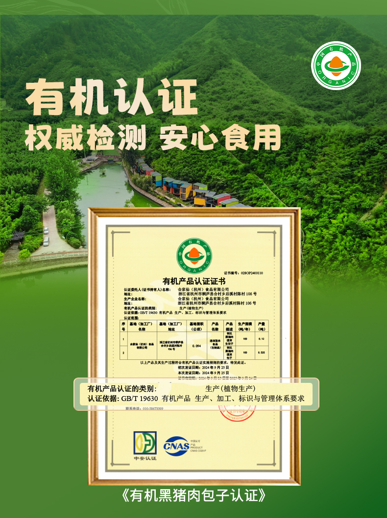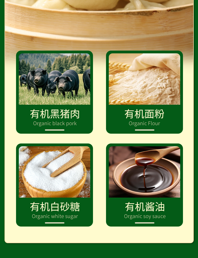 【产品配料】有机小麦粉、有机黑猪肉、有机酱油、有机白砂糖等