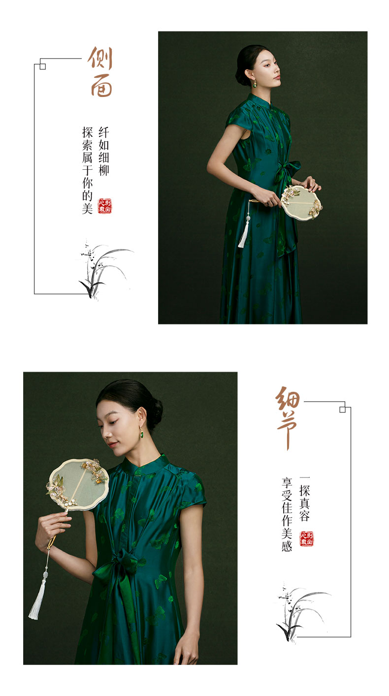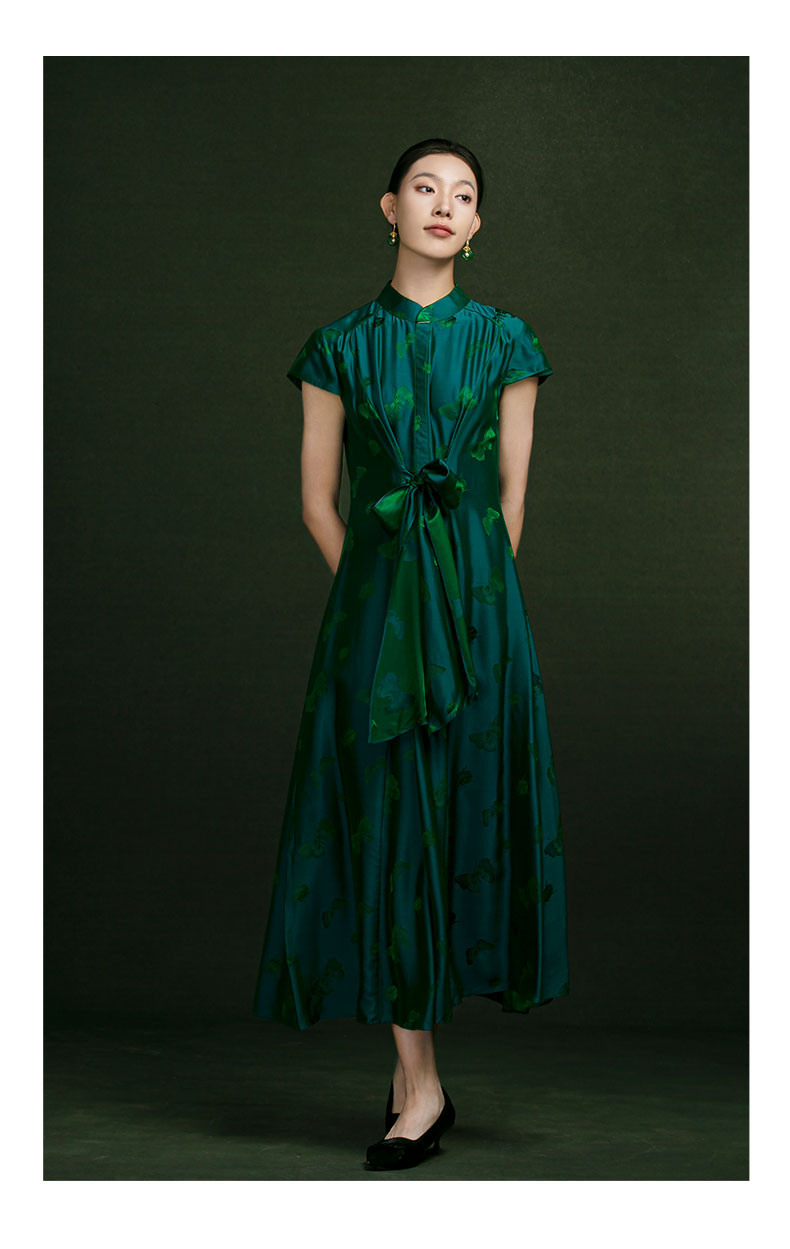 吉祥衣家新中式国风新款高端气质显瘦修身女装翠叶藏蝶真丝连衣裙