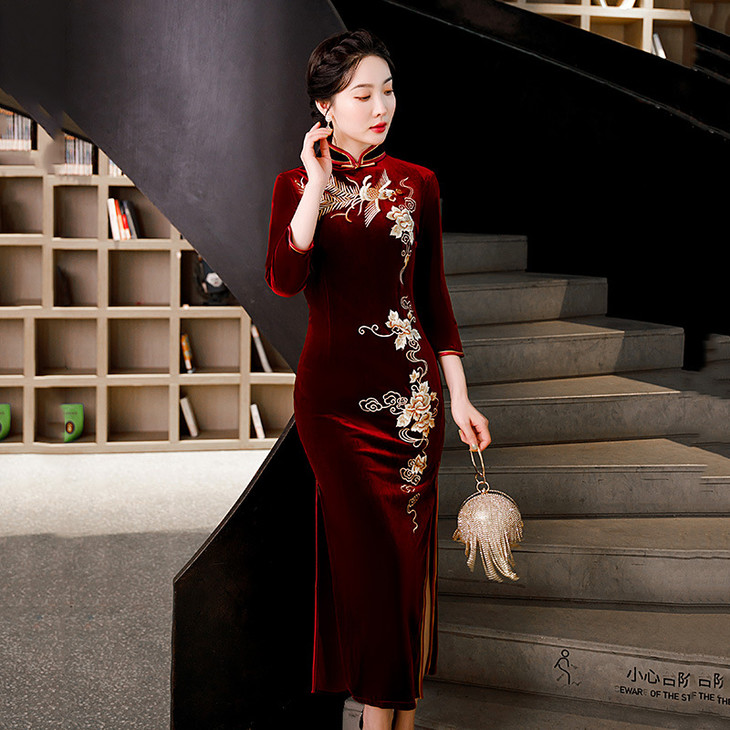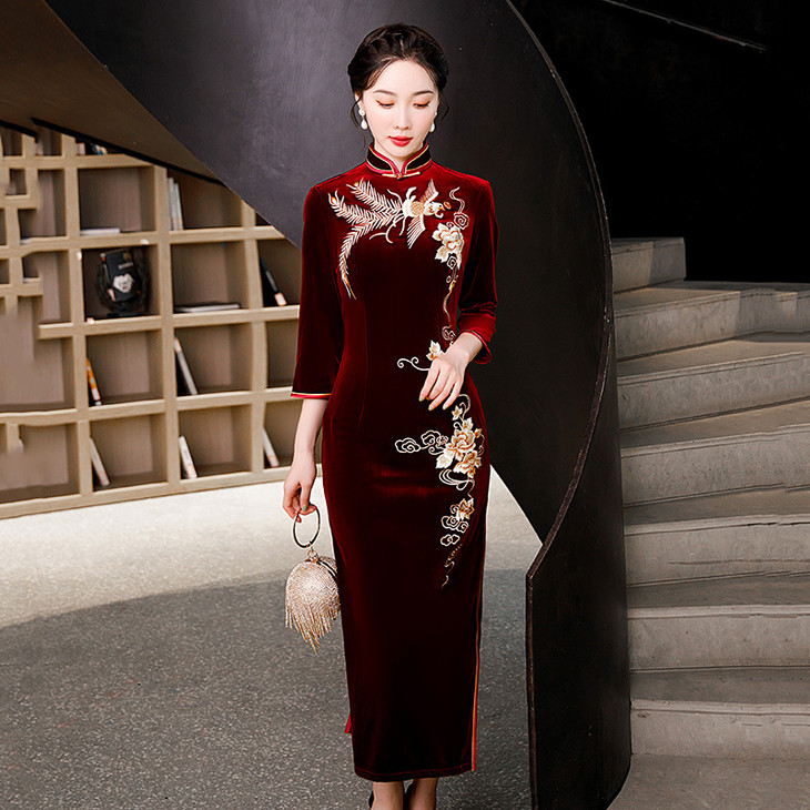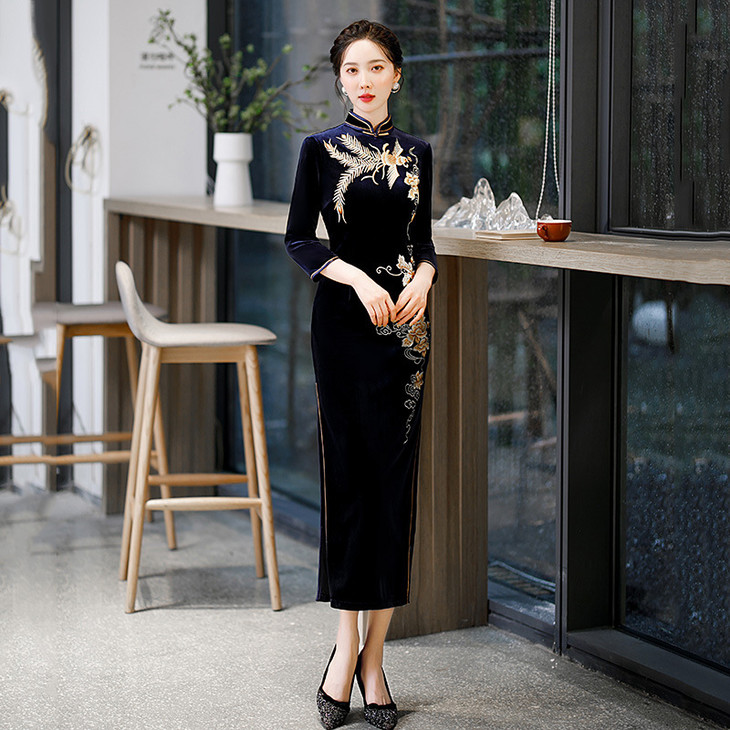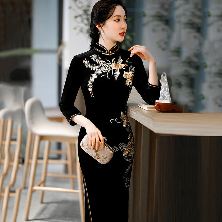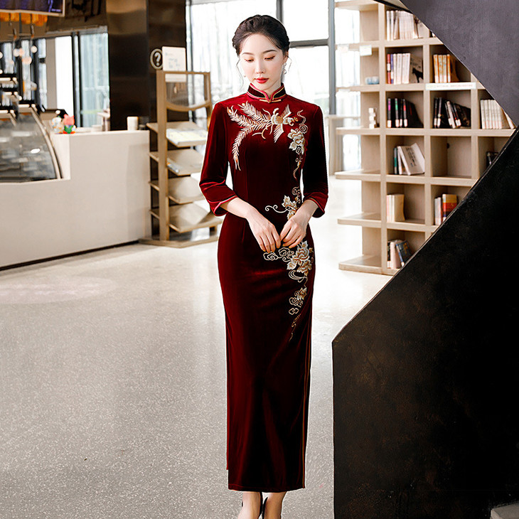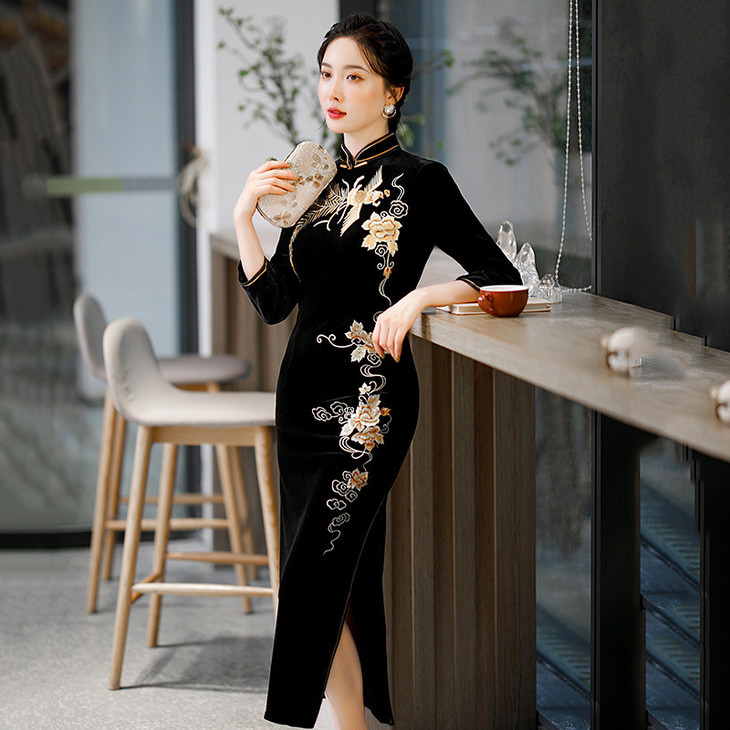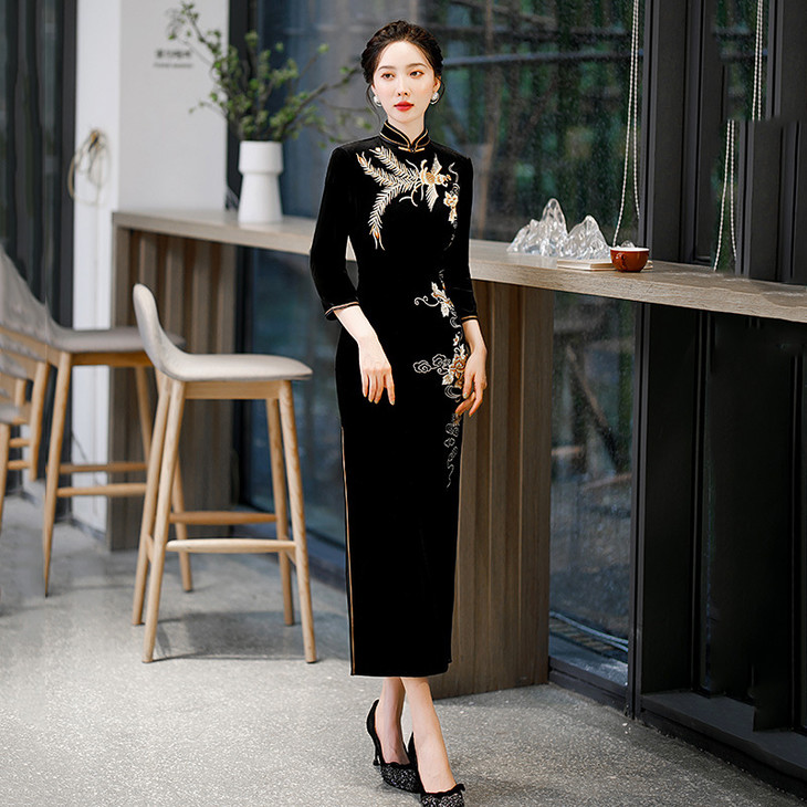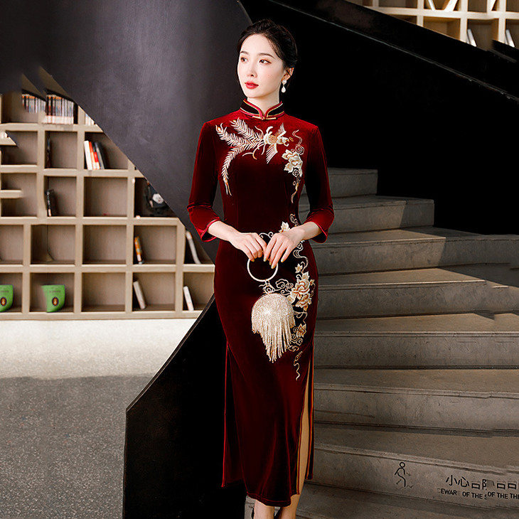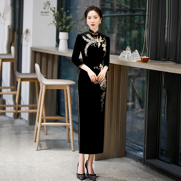 中式刺绣金丝绒国风长款改良旗袍 SC13543