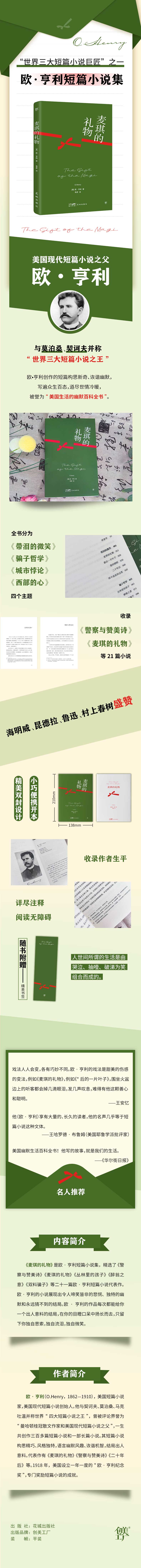 1.“美国现代短篇小说之父”欧•亨利,与莫泊桑、契诃夫并称“世界三大短篇小说之王”!2.海明威、昆德拉、村上春树、鲁迅盛赞的作家! 3.全书分为带泪的微笑、骗子哲学、城市悖论、西部的心四个主题,收录《警察与赞美诗》《麦琪的礼物》等名篇。短小隽永,犀利幽默,结局神反转! 4.全新设计,小巧便携开本。收录作者生平小传,详尽注释,阅读无障碍。附赠精美书签。5.读短篇小说,必定绕不开欧•亨利。6.欧•亨利创作的短篇构思新奇、诙谐幽默,写遍众生百态,道尽世情冷暖,被誉为“美国生活的幽默百科全书”。