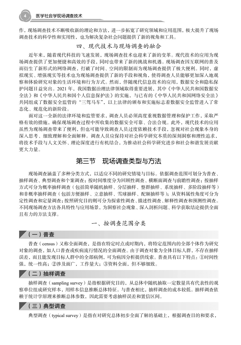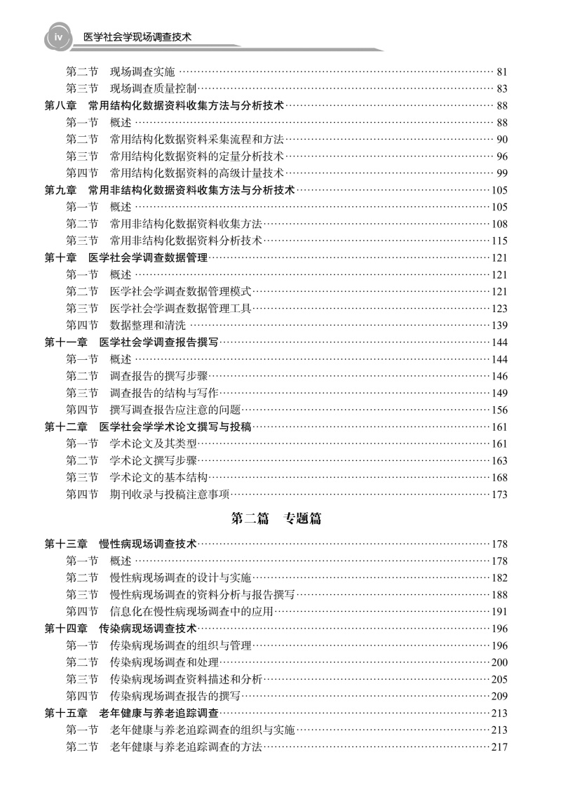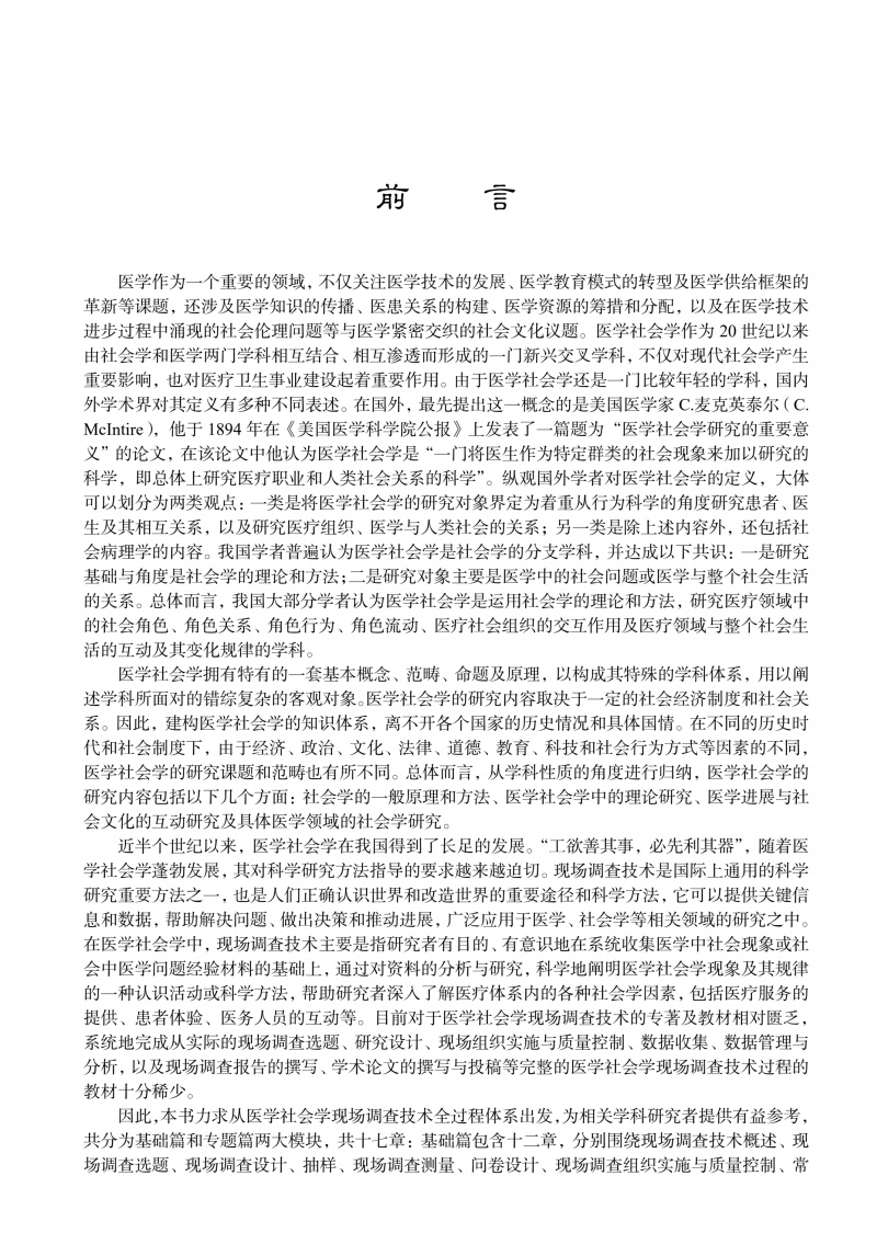 本书系统介绍了医学社会学中开展现场调查所需的方法与操作流程,涵盖调查选题、研究设计、抽样与测量、资料收集与分析、调查报告与论文撰写等关键环节。全书分为"基础篇"与"专题篇"两部分。基础篇重点阐释问卷设计、质量控制、结构化数据与非结构化数据收集方法与分析技术等核心内容;专题篇结合重大疾病、重点人群、重大调查活动等典型应用场景,通过具体案例呈现方法论的实践应用价值,凸显学科的交叉性与实践的指导性。全书融入了医学人文与思政教育理念,旨在培养具备社会洞察能力和实地研究能力的复合型人才,推动我国医学社会学研究发展与实践。