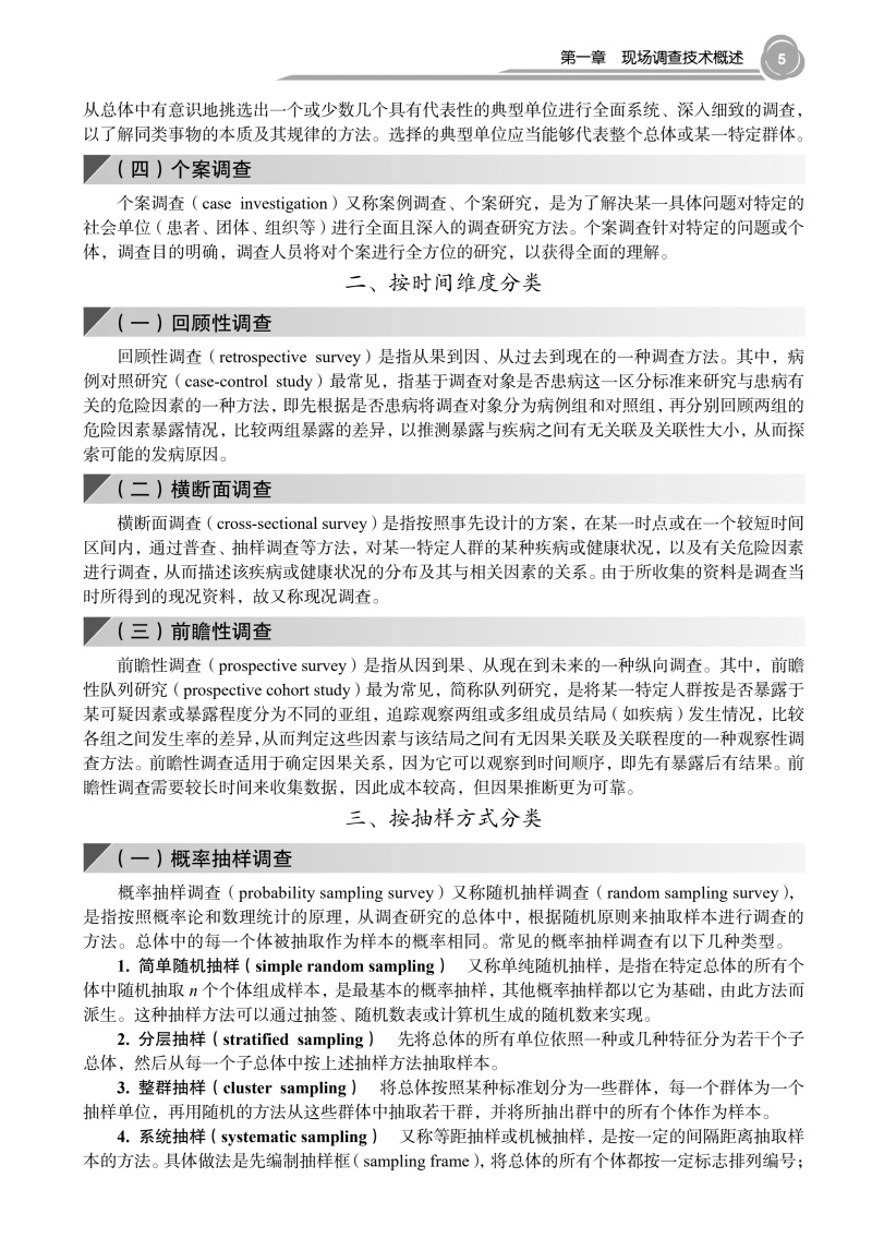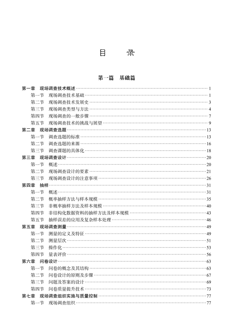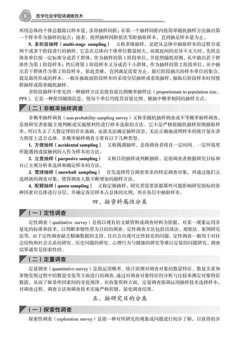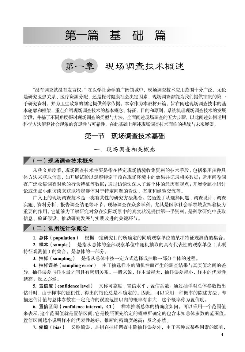 本书系统介绍了医学社会学中开展现场调查所需的方法与操作流程,涵盖调查选题、研究设计、抽样与测量、资料收集与分析、调查报告与论文撰写等关键环节。全书分为"基础篇"与"专题篇"两部分。基础篇重点阐释问卷设计、质量控制、结构化数据与非结构化数据收集方法与分析技术等核心内容;专题篇结合重大疾病、重点人群、重大调查活动等典型应用场景,通过具体案例呈现方法论的实践应用价值,凸显学科的交叉性与实践的指导性。全书融入了医学人文与思政教育理念,旨在培养具备社会洞察能力和实地研究能力的复合型人才,推动我国医学社会学研究发展与实践。