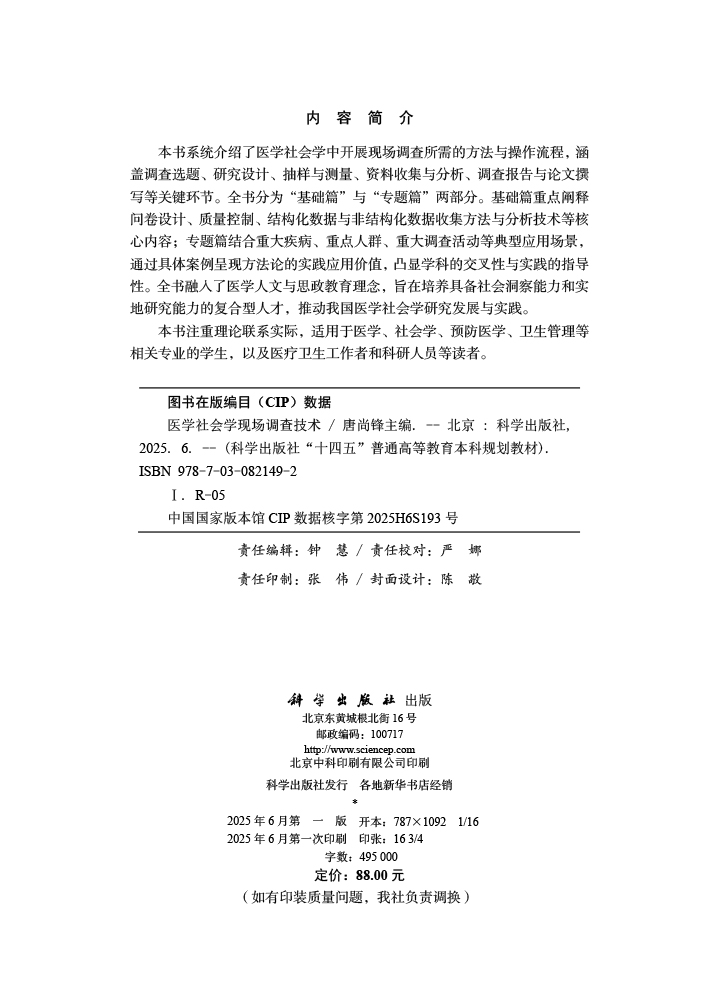 医学社会学现场调查技术 十四五普通高等教育本科规划教材 唐尚锋 介绍了医学社会学中开展现场调查所需的方法与操作流程科学出版社