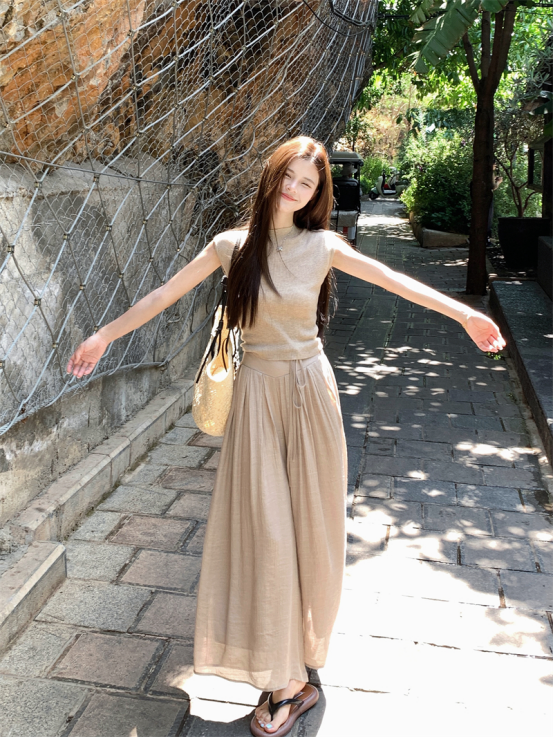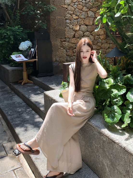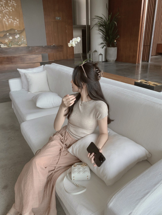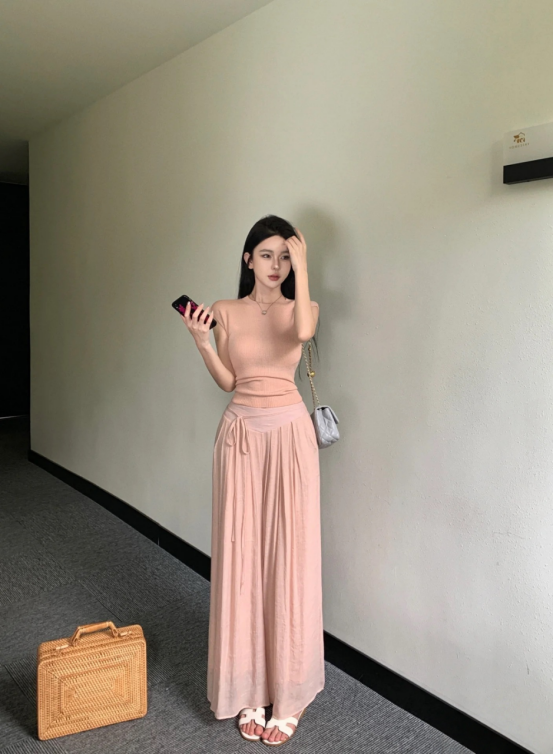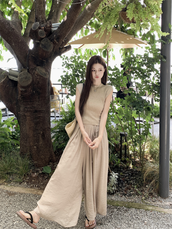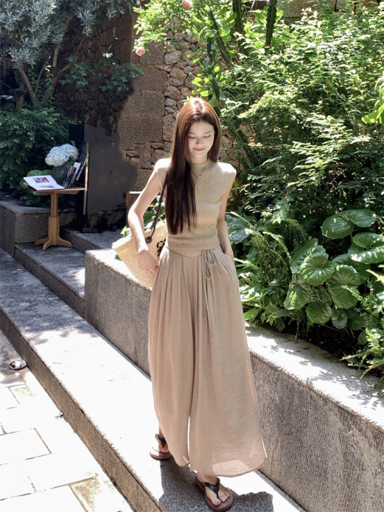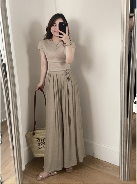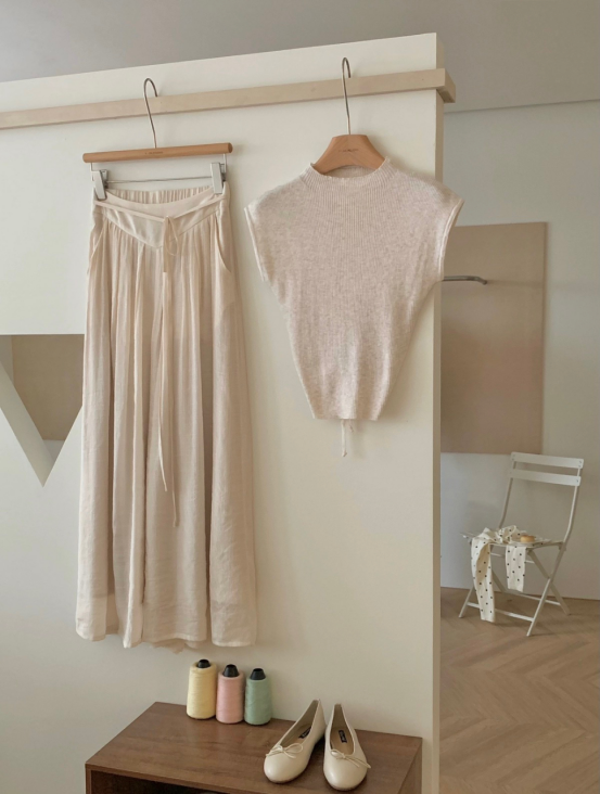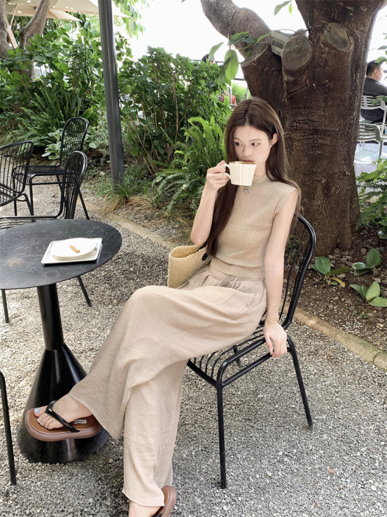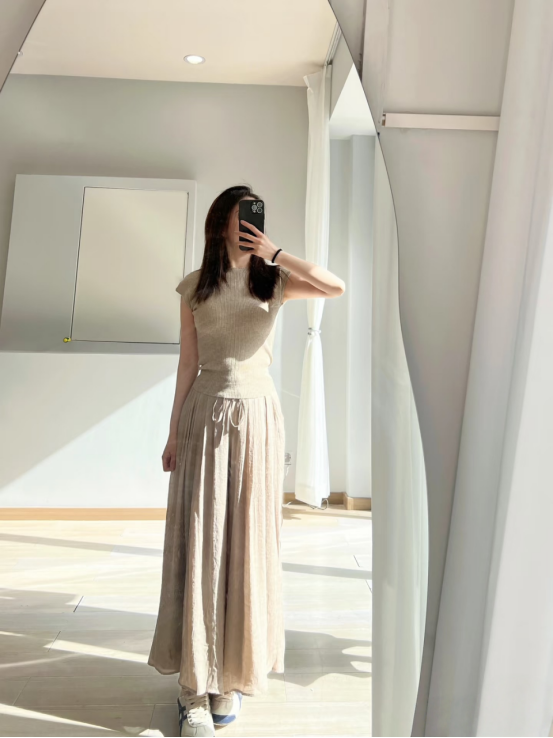 融合了浅驼的质朴与米白的纯净,低饱和度中透出烘焙般的暖意,自带慵懒疗愈氛围。 版型设计:慵懒不邋遢,藏肉显瘦 无袖针织上衣:修身剪裁贴合身形,展现锁骨与肩颈线条,轻盈露肤设计增添春日呼吸感,内搭可叠穿白T或吊带,打造层次。 阔腿裤:高腰+垂坠感面料,巧妙修饰腿型与腰胯,宽松裤腿藏肉显瘦,行走间自带飘逸气场,呼应“松弛美学”的穿搭哲学