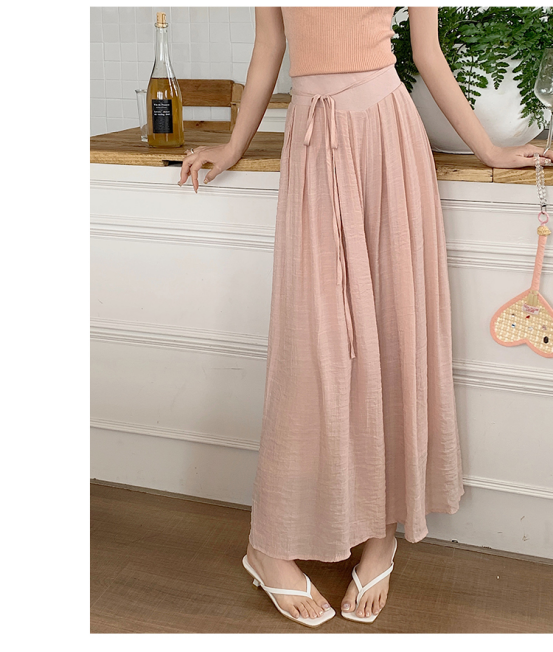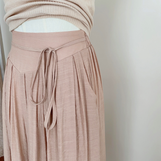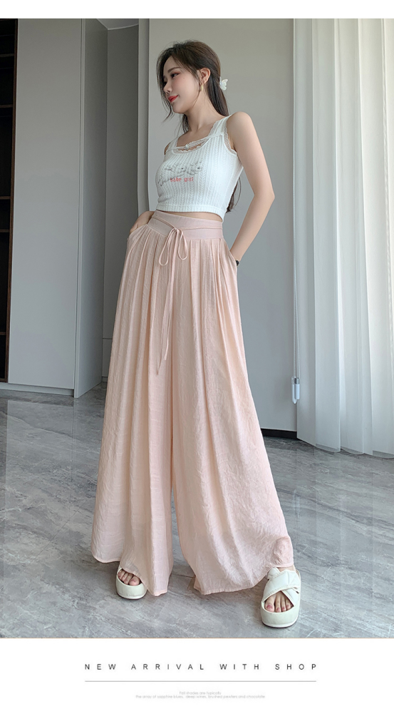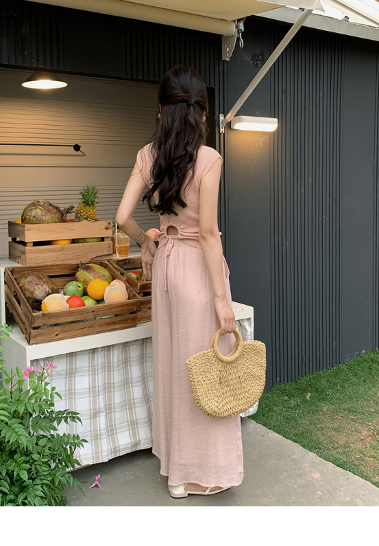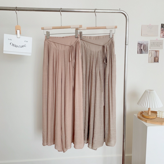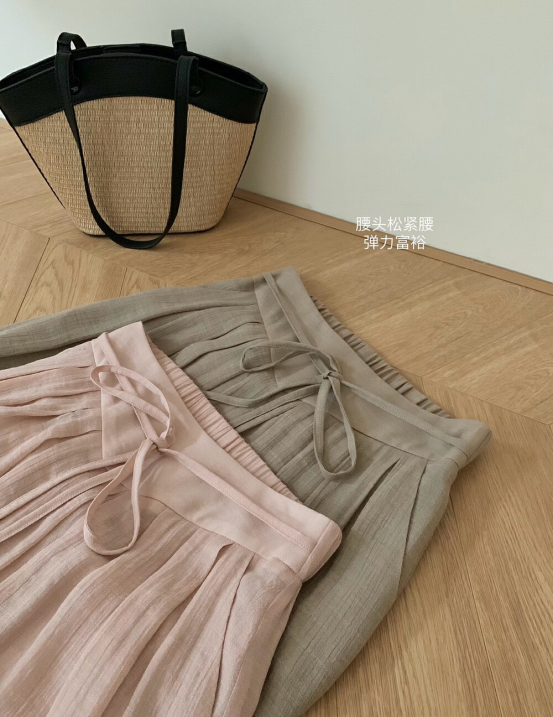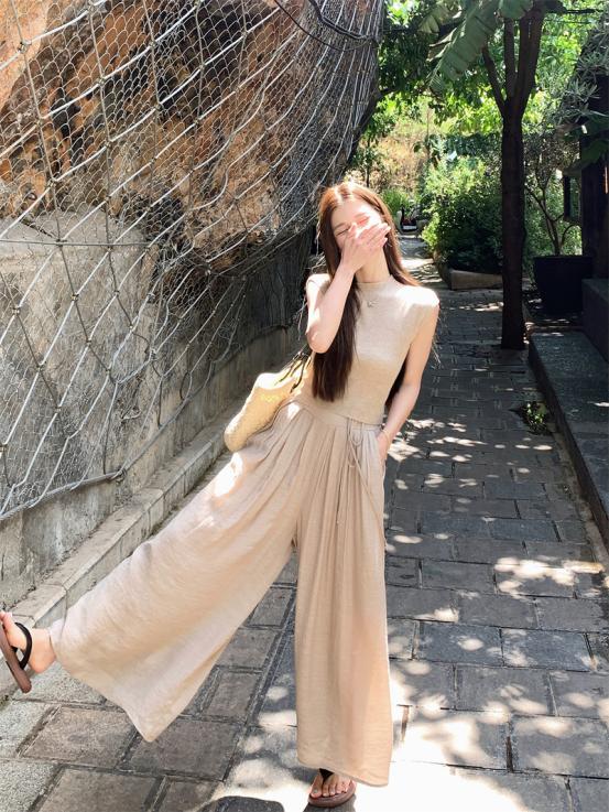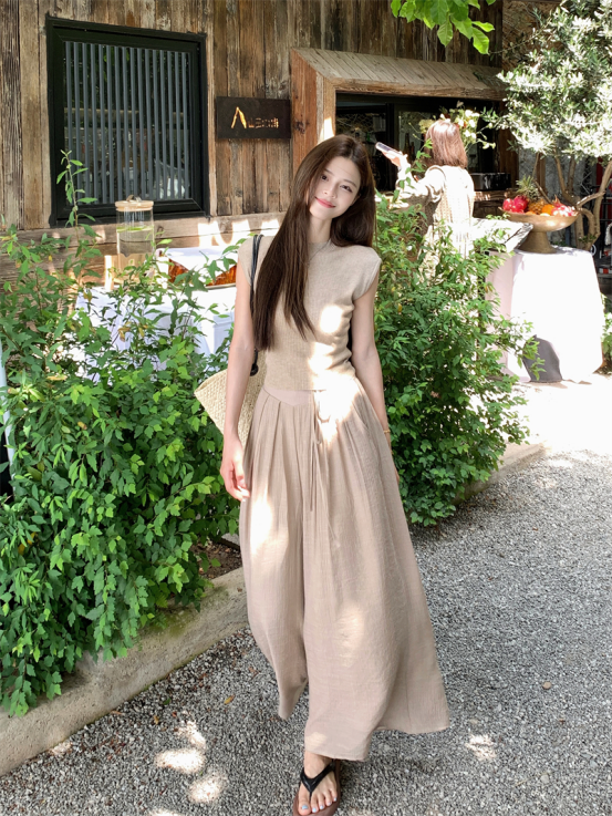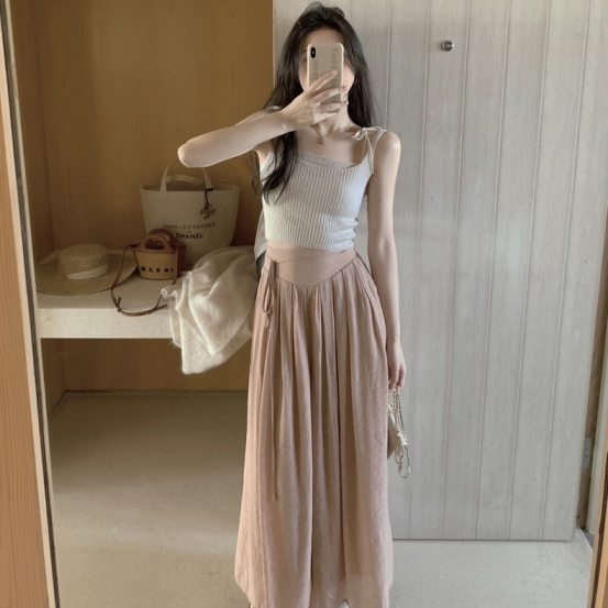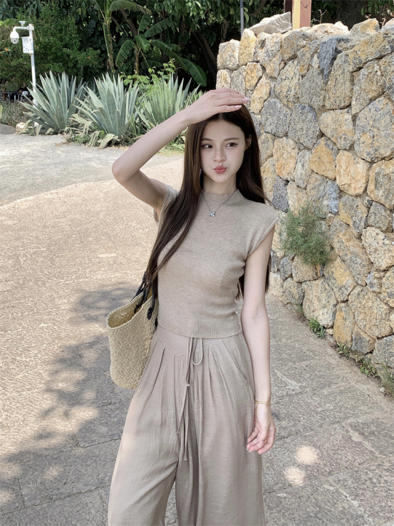 融合了浅驼的质朴与米白的纯净,低饱和度中透出烘焙般的暖意,自带慵懒疗愈氛围。 版型设计:慵懒不邋遢,藏肉显瘦 无袖针织上衣:修身剪裁贴合身形,展现锁骨与肩颈线条,轻盈露肤设计增添春日呼吸感,内搭可叠穿白T或吊带,打造层次。 阔腿裤:高腰+垂坠感面料,巧妙修饰腿型与腰胯,宽松裤腿藏肉显瘦,行走间自带飘逸气场,呼应“松弛美学”的穿搭哲学