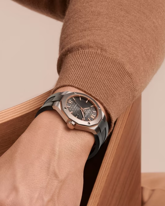 镜面材质 | 蓝宝石水晶玻璃 | 表盘 | 抛光与缎面打磨的精钢表壳,2N镀金PVD精钢环装饰于表壳侧面 太阳缎面打磨的漆质石板灰色表盘与同色的山海饰纹,5N镀金PVD 精钢铆钉式罗马数字与时标覆有夜光涂层 (C1, 蓝光),多面的5N镀金PVD精钢指针,日期视窗位于3点钟位置 以4颗螺钉固定的喷砂钛金属表圈 日期显示 |