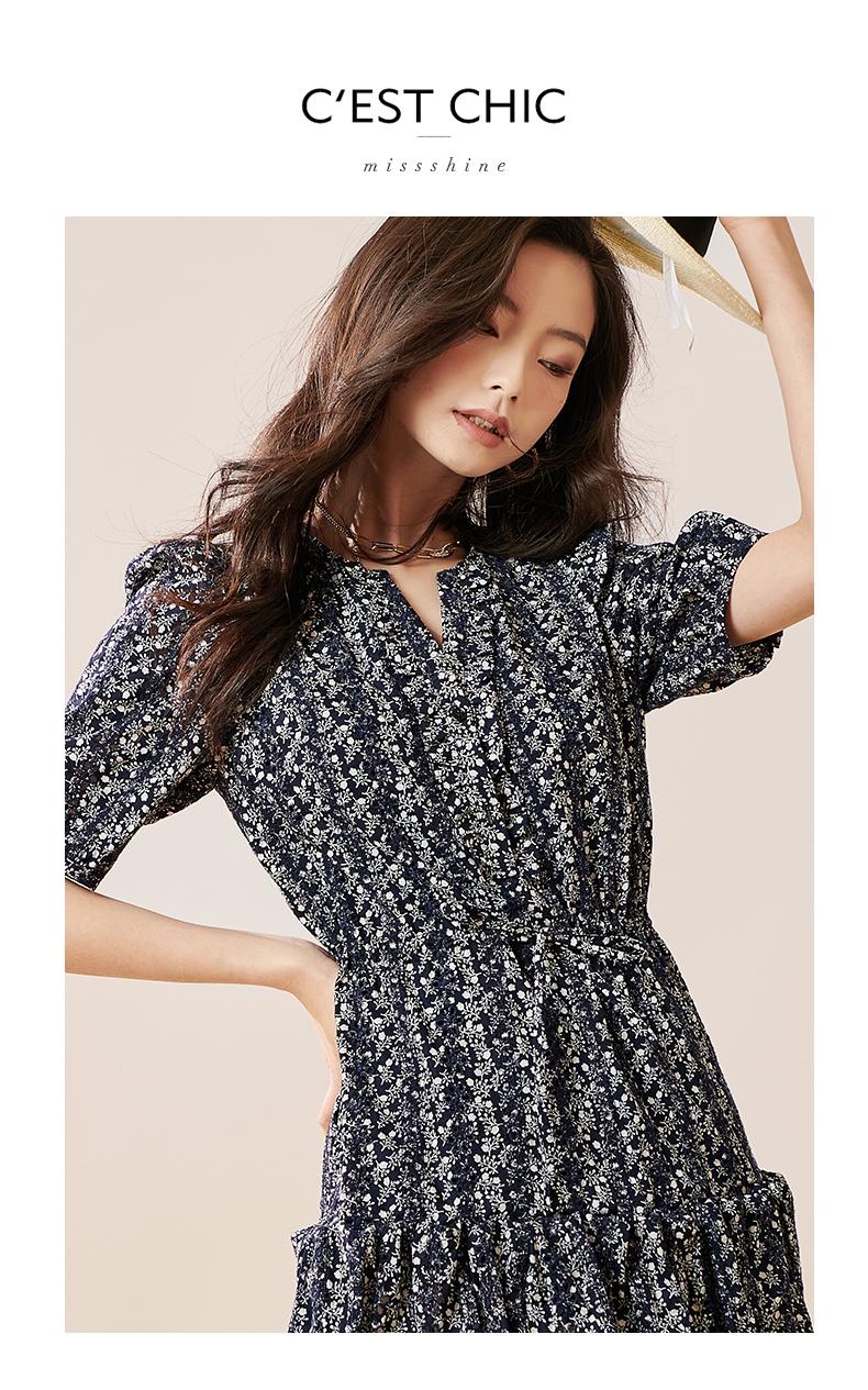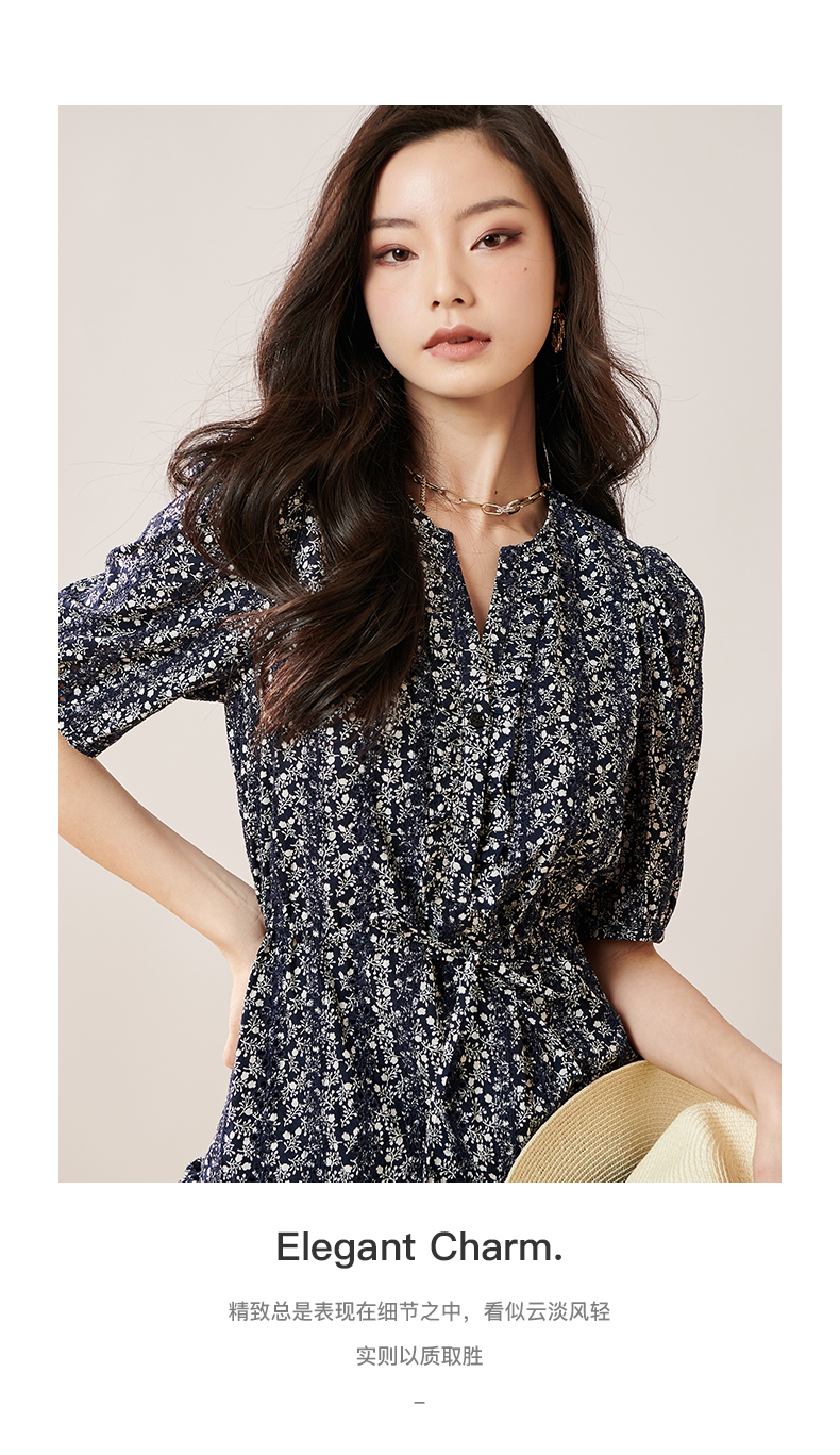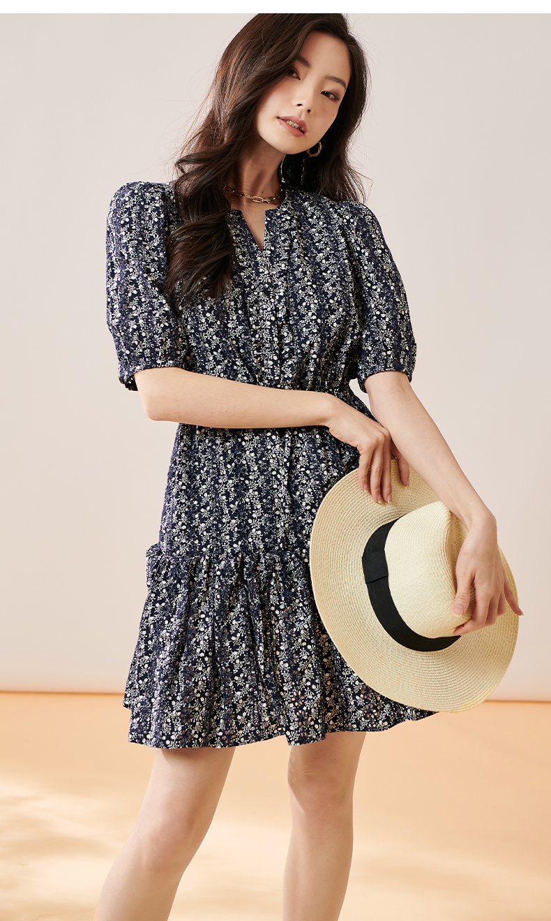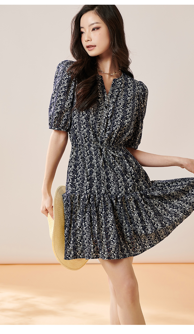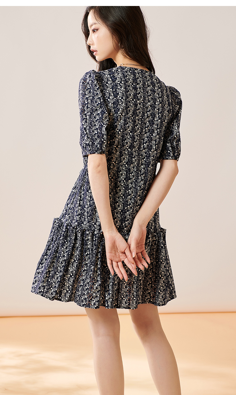 芳外2025夏季新款优雅减龄碎花连衣裙泡泡袖宽松短款a字裙子0299
