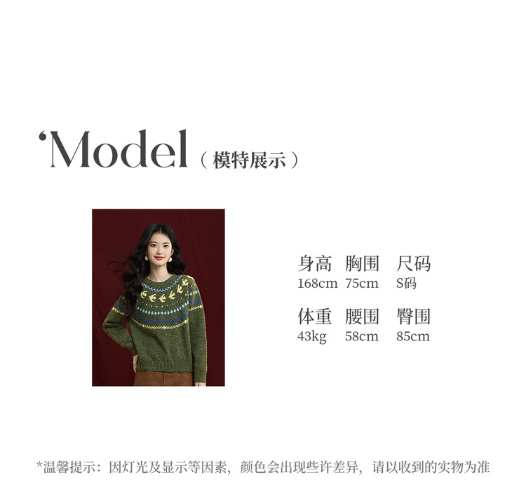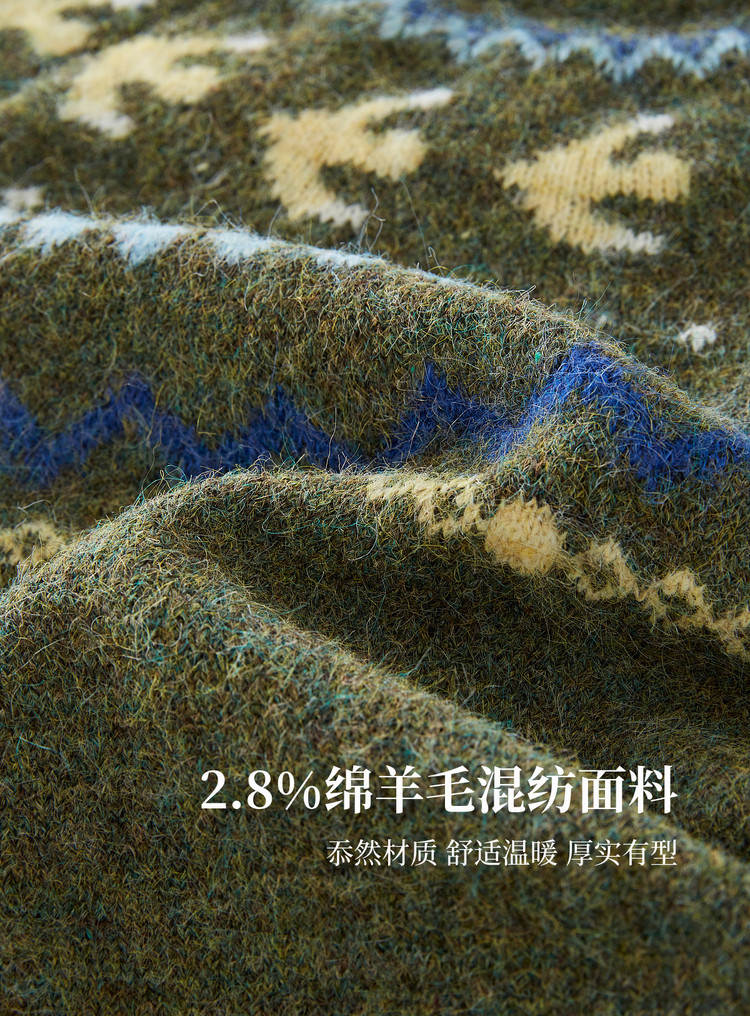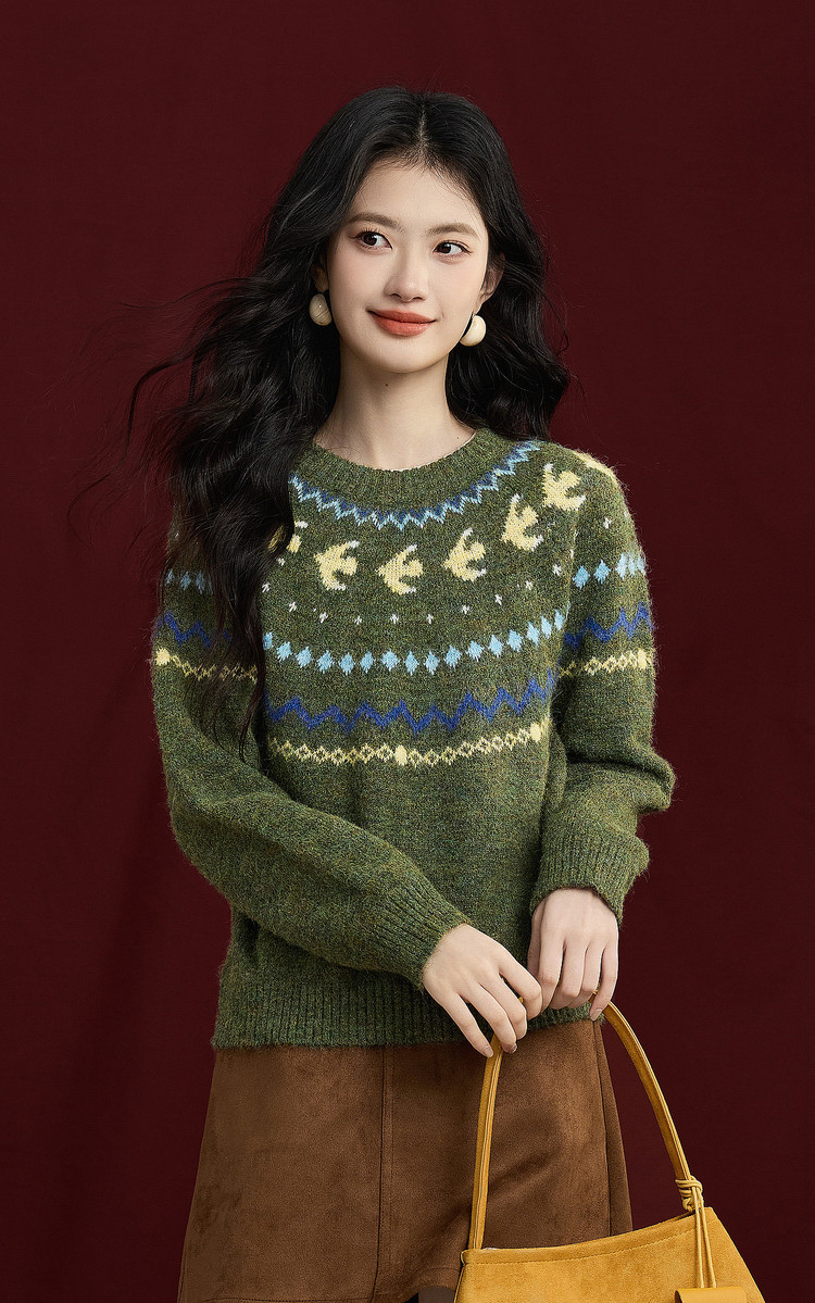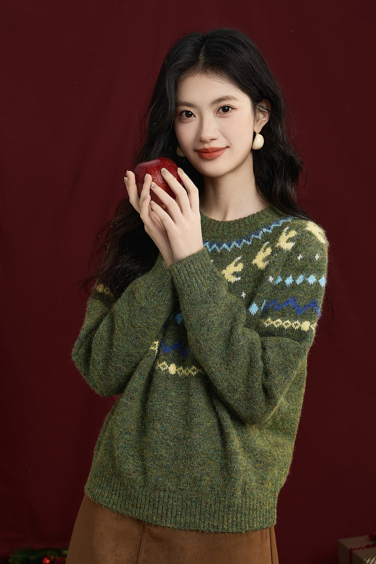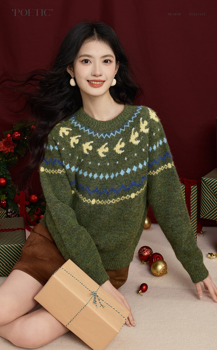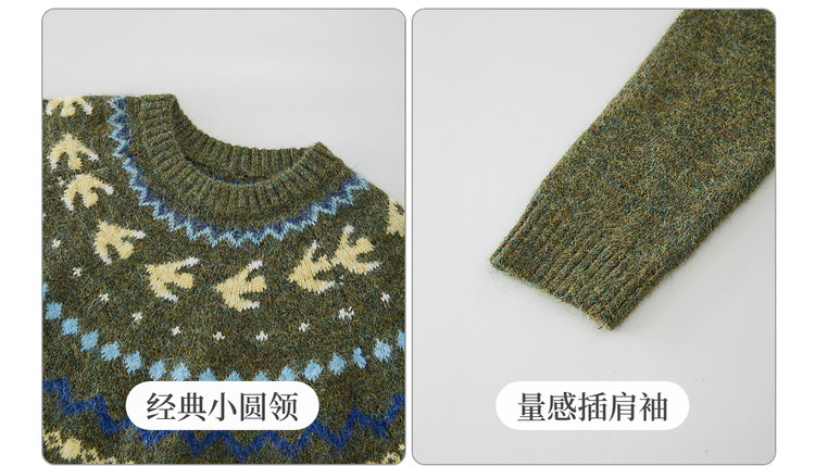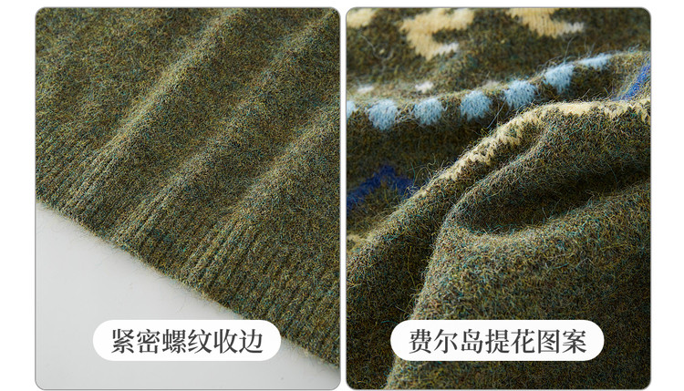 【12/24新品6.5折】熙世界圣诞节穿搭提花毛衣女费尔岛复古绿色针织衫2025秋冬季新款