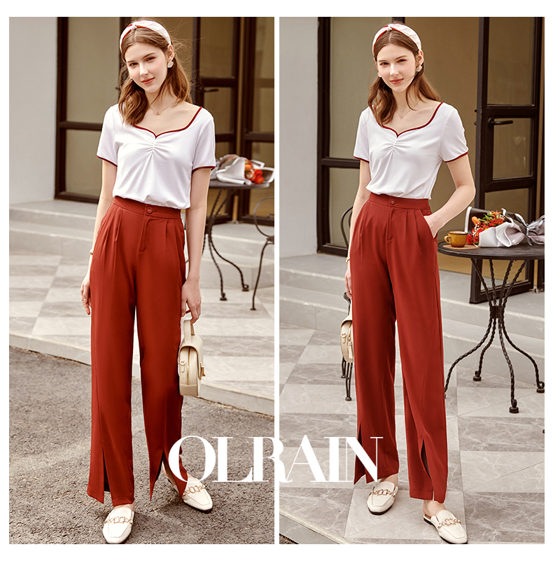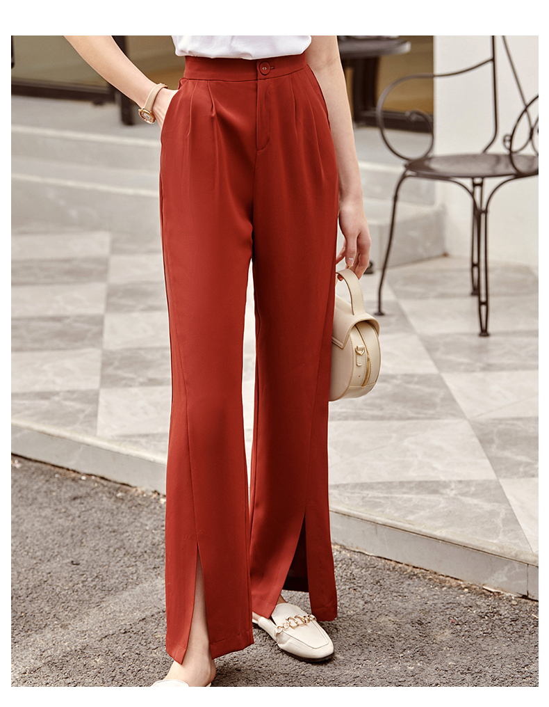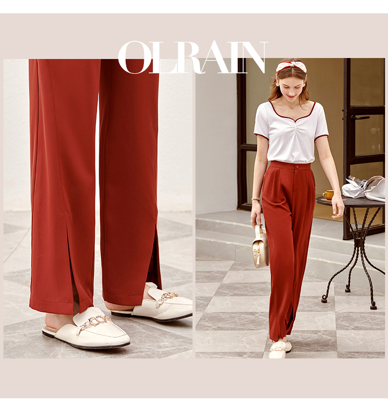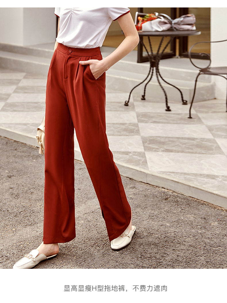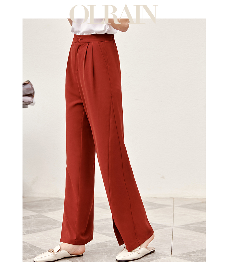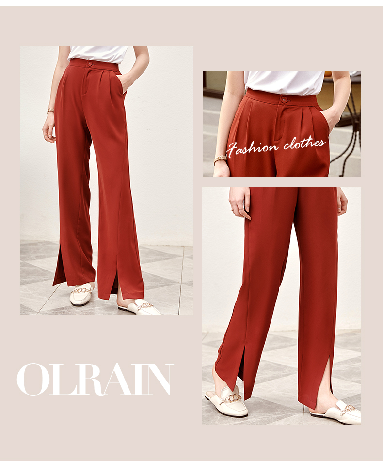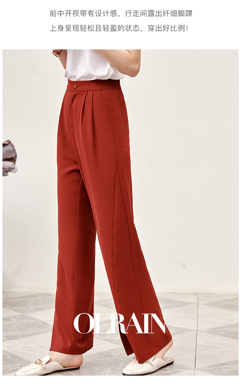 欧芮儿红色休闲裤女夏2021新款高腰显瘦气质优雅时髦开衩拖地长裤