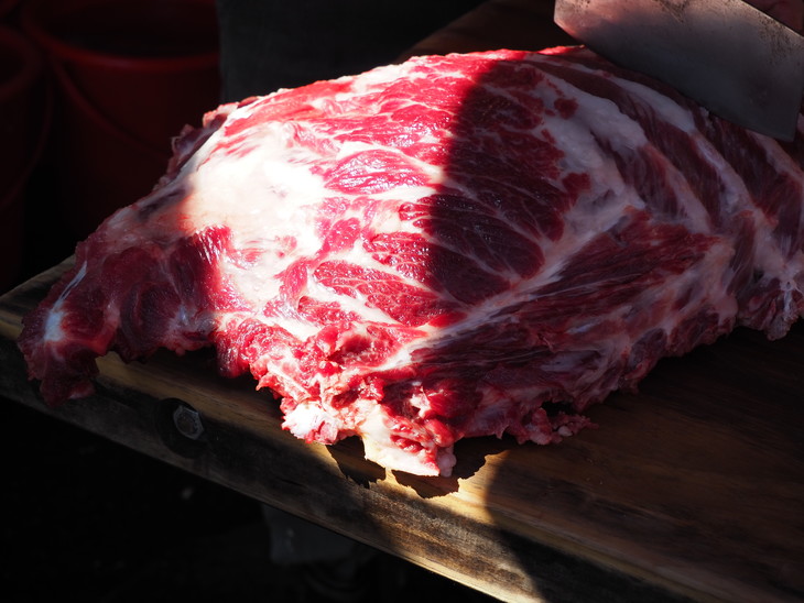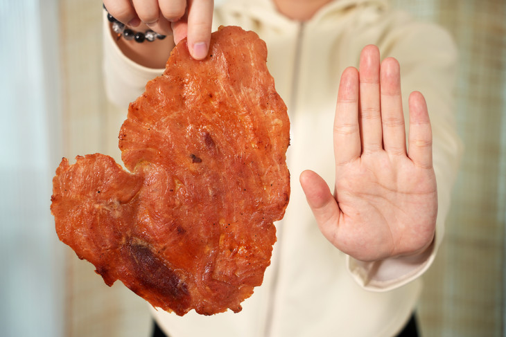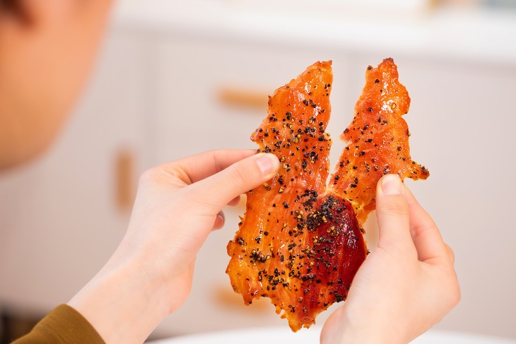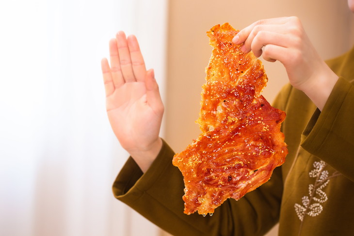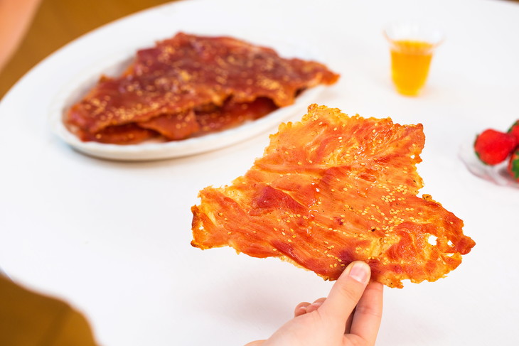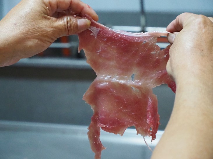 市面上绝大部分的猪肉脯,都是碎肉制成。里面用冻猪肉、肉糜、混合着鸡肉、添加淀粉来降低成本。