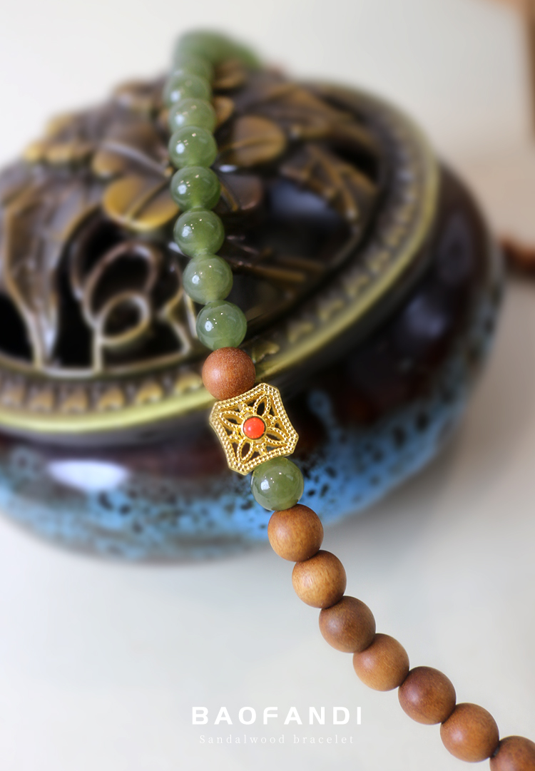 【材质】:和田玉(6mm左右),檀香木(6mm左右),金属彩色部分是烧蓝工艺,金属部分采用的为14k包金工艺(俗称合金包金,在金属材质表面包裹一层14k金)