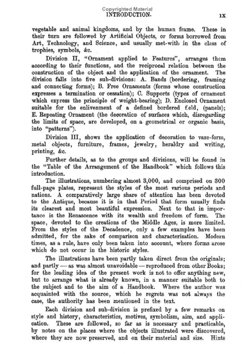 本书以完整版最终完整版的形式重新出版,收录了迄今为止规模最大的单卷古典艺术图案合集。它再现了希腊罗马、中世纪欧洲、伊斯兰、文艺复兴、巴洛克以及十九世纪早期艺术、建筑和设计领域的素材,总计超过3000件设计作品,为艺术家、手工艺人和学生呈现。书中的特色设计元素包括网格纹饰、哥特式窗饰、几何图案、阿坎托斯叶纹、莲花纹饰、动物纹饰、怪诞人物纹饰、回纹带纹饰、链条纹饰、交织纹饰、玫瑰花结纹饰、波浪纹饰、螺旋纹饰、环纹边框、波纹边框、尖顶饰、钩纹、滴水嘴兽纹饰、叶饰、嵌板、重复装饰以及数百种其他元素。其他图版展示了装饰陶瓶、宗教器皿、武器、家具、灯具、珠宝和其他文物,以及纹章图案和装饰字母。