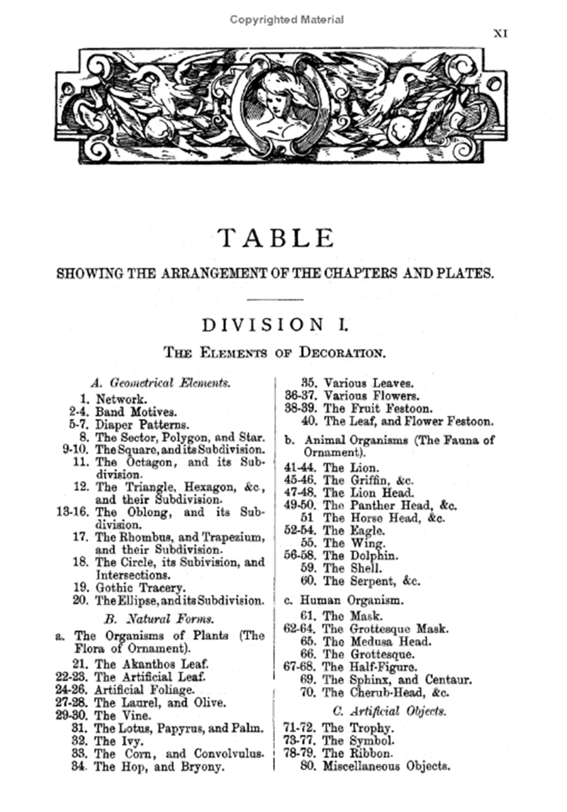 Featured design elements include networks, Gothic tracery, geometric designs, akanthos leaves, lotus ornamentation, animal ornamentation, grotesque figures, fret bands, chains, interlacements, rosettes, undulations, spirals, link borders, cresting borders, finials, crockets, gargoyles, foliations, panels, repeated ornaments, and hundreds of other elements. Other plates show decorated pottery vases, religious utensils, weapons, furniture, lamps, jewelry, and other artifacts, in addition to heraldic motifs and ornamental letters.
