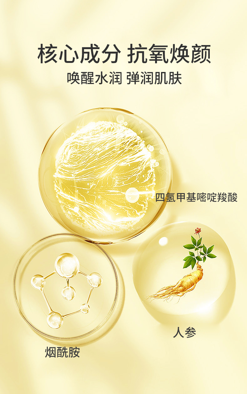 一句话卖点:淡纹紧致,胶原再生,弹嫩充盈,紧致细腻,一片焕现饱满胶原肌