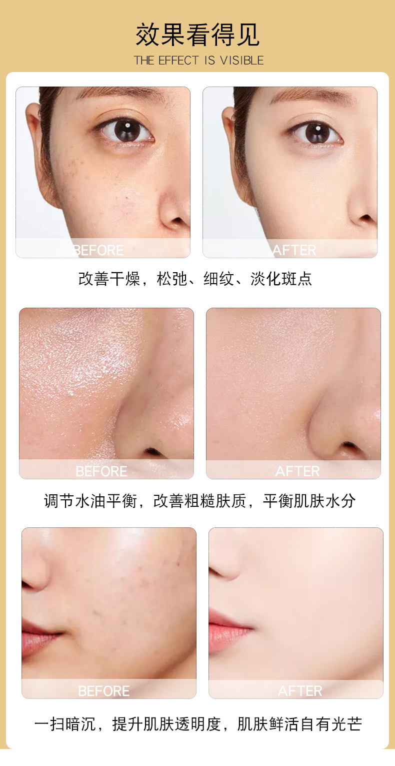 促进新皮肤细胞生成,减少和防止细纹、皱纹增加肌肤活力和能量,提亮肤色