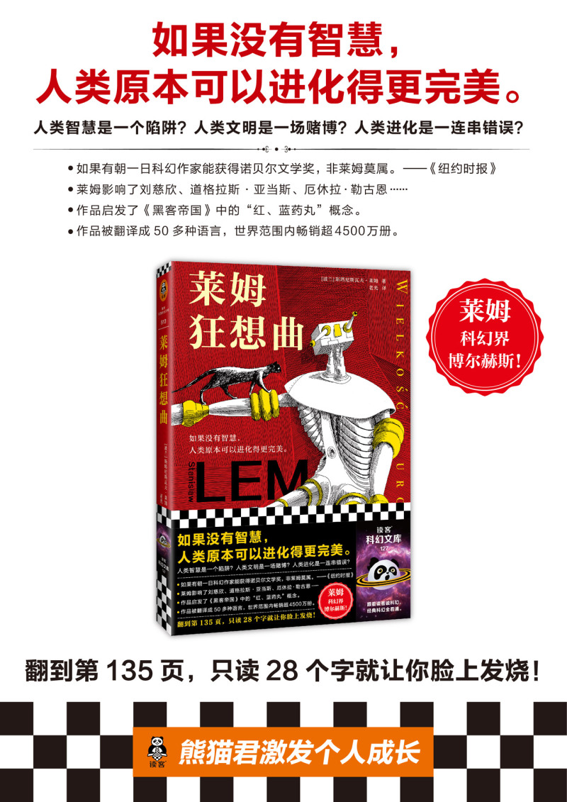 斯塔尼斯瓦夫·莱姆,波兰著名科幻作家、哲学家,被誉为“科幻界的博尔赫斯”,《纽约时报》曾称他“值得一座诺贝尔文学奖”。迄今,莱姆作品已被翻译成50多种语言,在世界范围内畅销超4500万册。莱姆以博学闻名于世,智商高达180,通晓英、法、德等多种语言,医学、生物学、数学、哲学、语言学……信手拈来,无所不知。莱姆的风格怪诞,热衷于用后现代实验拓展文学边界,痴迷于探讨超前时代的科幻主题:技术的本质、人类与外星智慧的沟通困境、对人类局限性的绝望、人类在宇宙中的地位……他的作品超越了科幻的思维,直抵哲学的深度,甚至被列为哲学系学生的教材。莱姆的《索拉里斯星》《未来学大会》多次被搬上大银幕。他的作品启发了《黑客帝国》中的“红、蓝药丸”概念,更影响了刘慈欣、道格拉斯·亚当斯等一大批科幻作家。2021年为莱姆诞辰100周年,波兰政府将之命名为“莱姆年”。