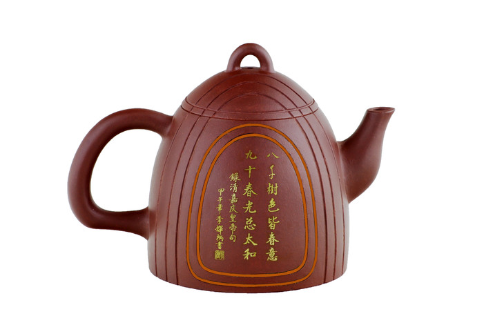 2015年10月10日,故宫迎来了90周年的隆重庆典, 鸿运斋特创意了这把壶以纪念这一重要时刻。这是一把历史厚重,充分体现故宫特色,反映两岸故宫文化脉络,展现艺术个性的紫砂壶。有茶诗皇帝之美誉的乾隆,就是这款紫砂壶的“灵魂”。清宫档案资料显示,乾隆虽然是中国历代皇帝中,最会“玩”的一个,但他没有“玩物丧志”,而是“玩物增智”,通过各种雅玩陶冶了他的情操。不仅如此,乾隆还通过茶舍中的品茗,以淡化宫中的“官气”,强化和提倡廉政建设。著名的青花“三清杯”,就是乾隆对部下“清心、清欲、清廉”的廉政要求,为此在自己茶舍中所用的茶具,基本以“清心”的竹子为主要材质,竹炉、竹夹、竹筷、竹荷、竹针等。而这些竹茶具,给了故宫90周年紫砂壶以创意灵感,整把壶就是乾隆竹茶炉的器型,竹子在壶身上是筋囊,壶身开光珐琅彩画,绘明代唐寅的品茶图。一位智者在泉水边弹拨古琴,一旁香炉、竹炉、紫砂壶、沉香、茶叶罐、瓷茶杯等一应俱全。它反映了明代文人的茶道艺术,而这又是乾隆的最爱。壶身背面铭刻嘉庆帝手书对联:八千树色皆春意,九十春光总太和。两面开光珐琅画外的二条轮廓线,均镶竹丝以彰显“竹炉壶”的古朴与名副其实。