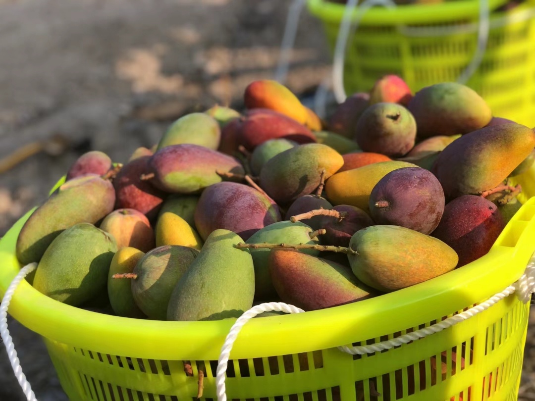 从事芒果种植多年熟练工人,在地头挑选采摘,果尖冒黄方可采摘,熟一颗摘一颗。