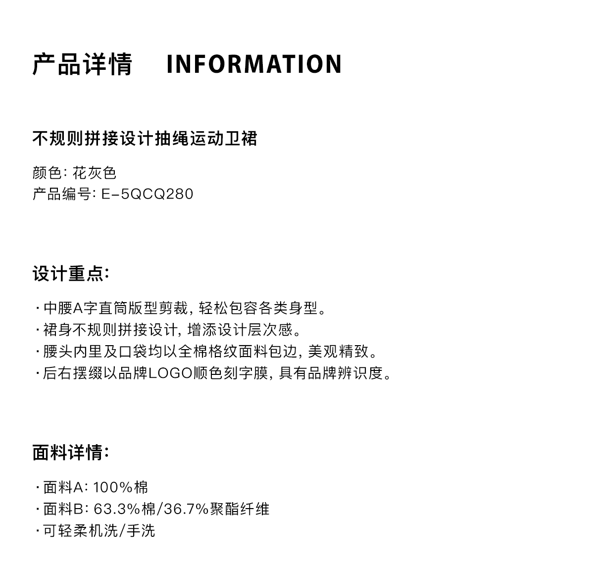 Evistub girls/E-5QCQ280/不规则拼接运动卫裙女秋
