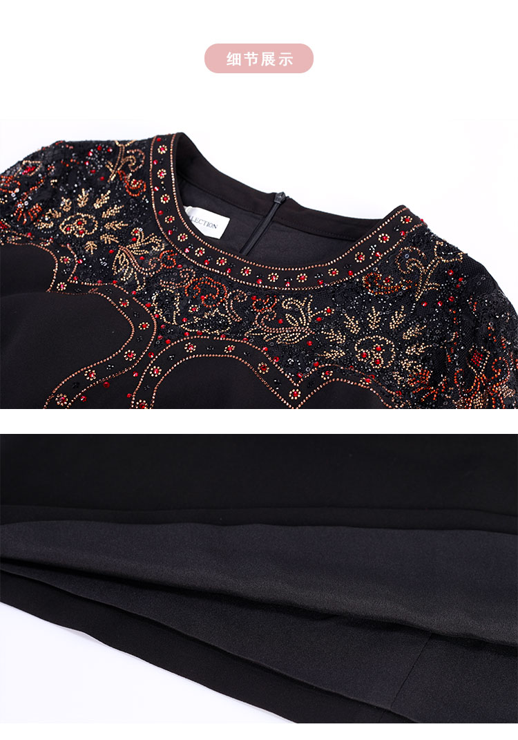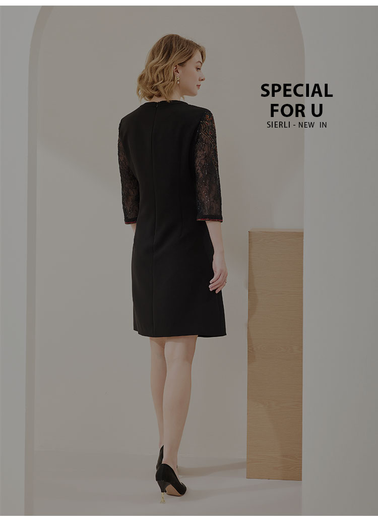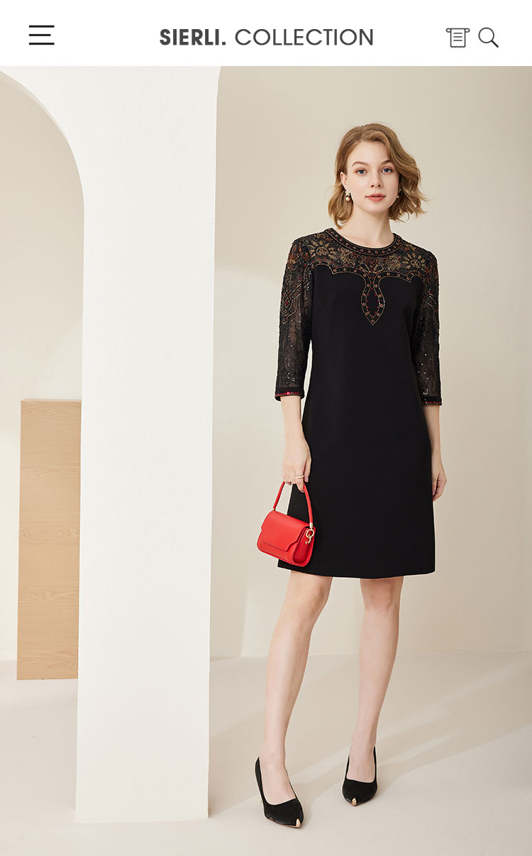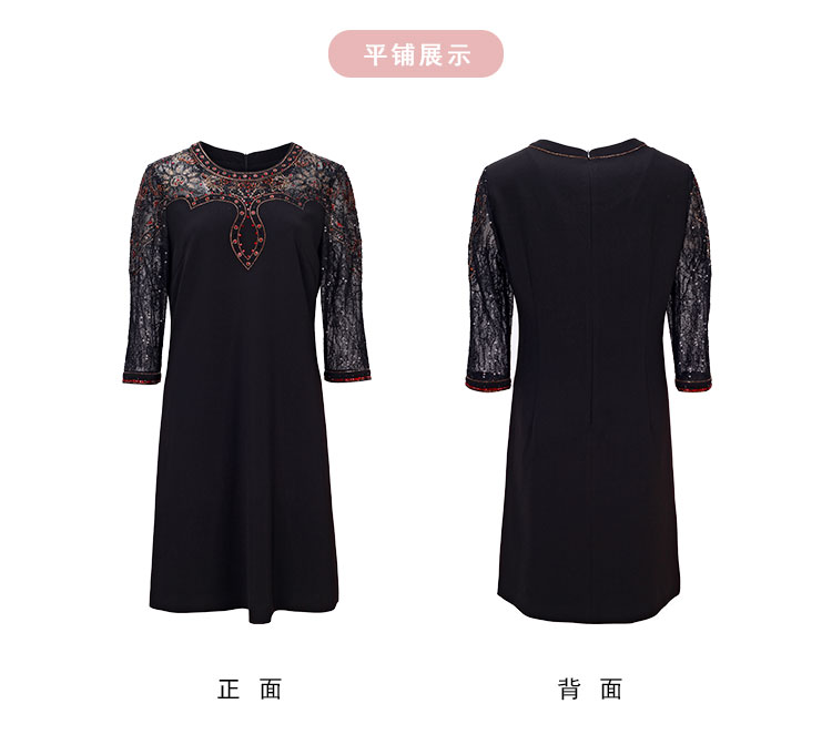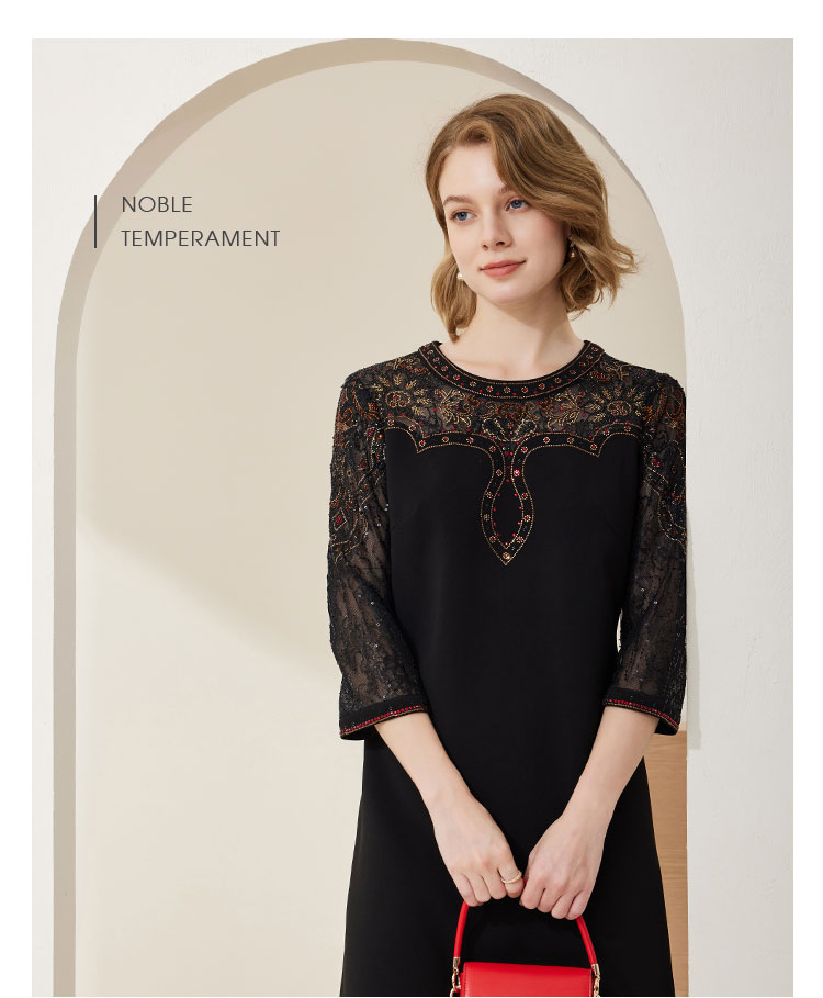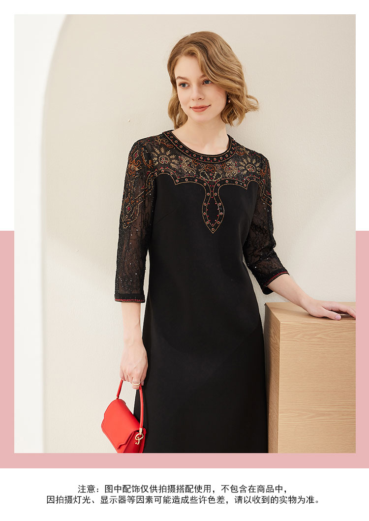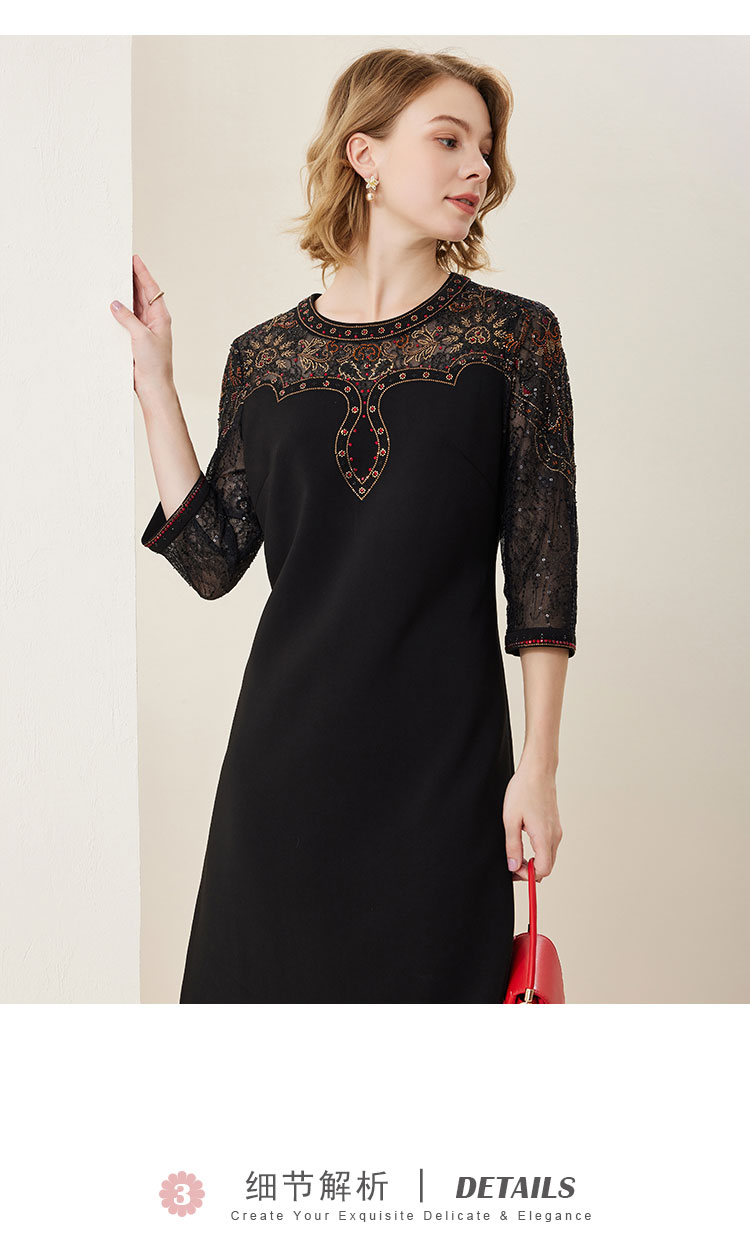 MC803斯尔丽2024春季新款华丽烫图修身显瘦小黑裙圆领七分袖连衣裙