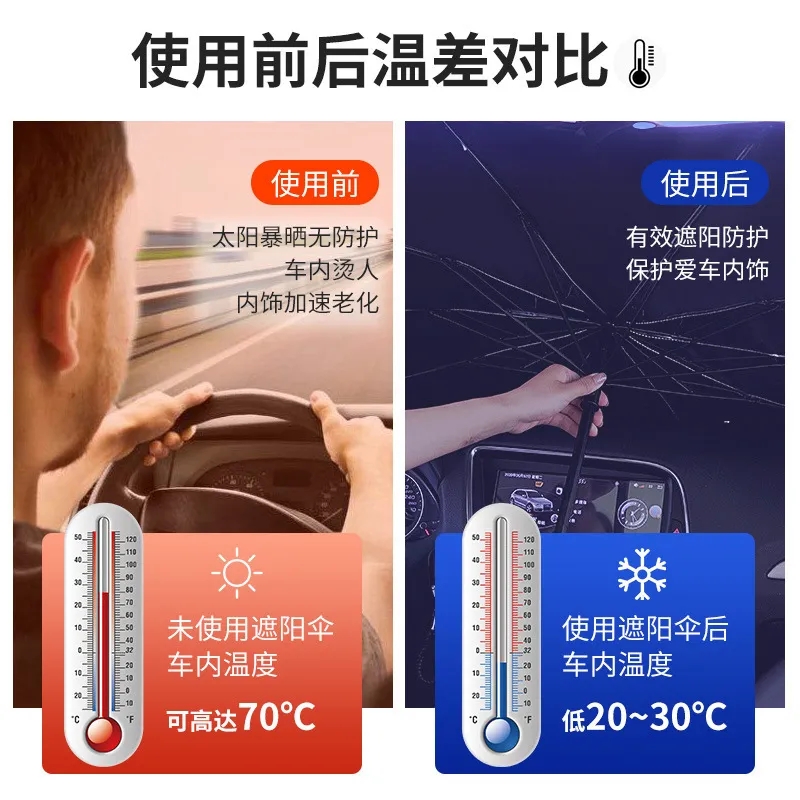 无需复杂安装,只需要像雨伞一样打开就可以使用,一键收纳,就算是女生也能轻松收纳,有了它,让爱车降温20度,告别高温暴晒!
