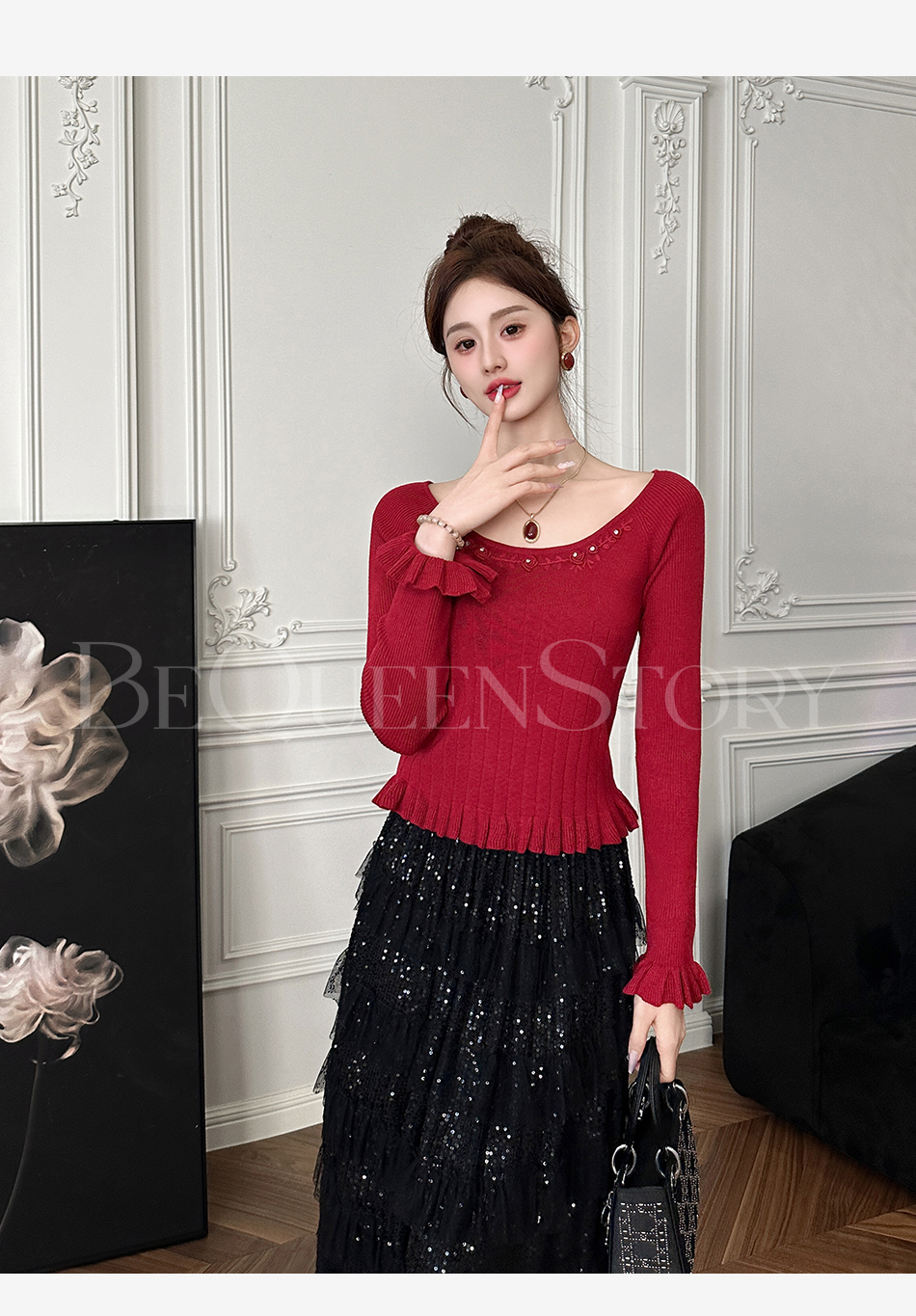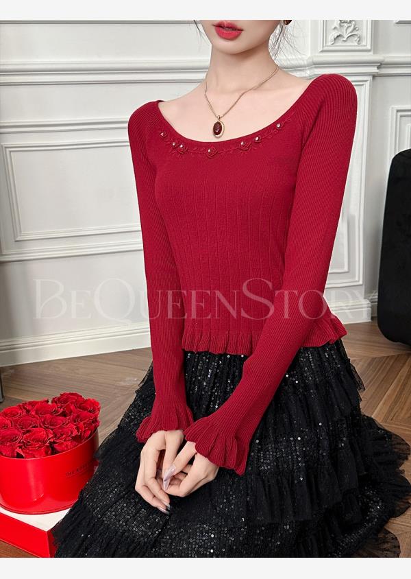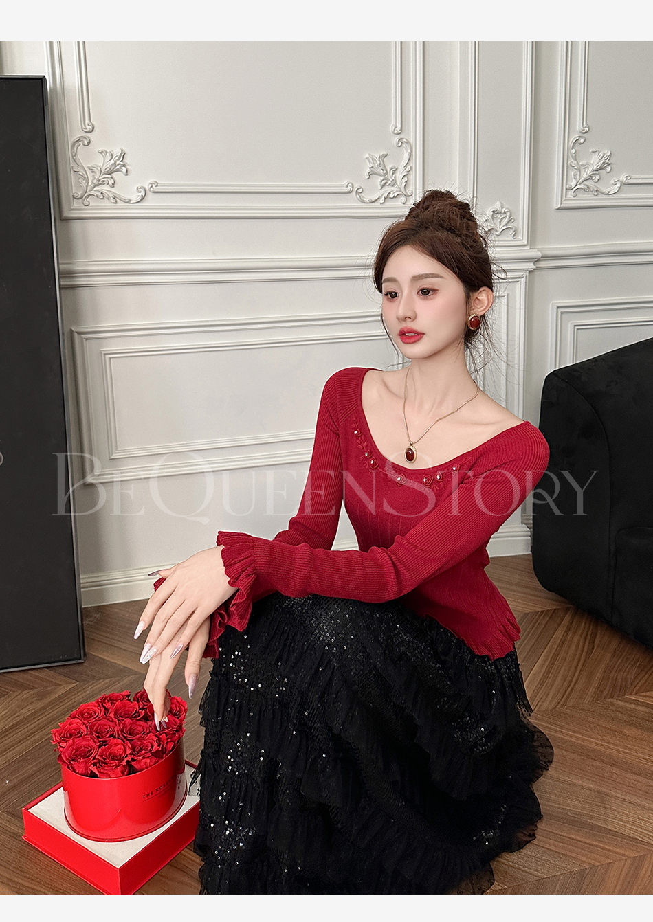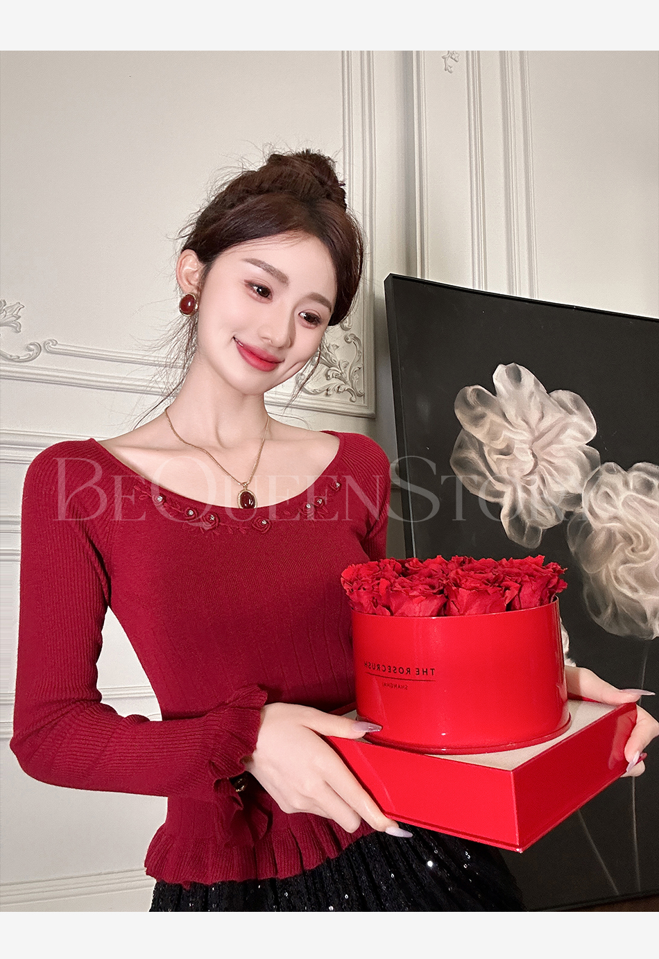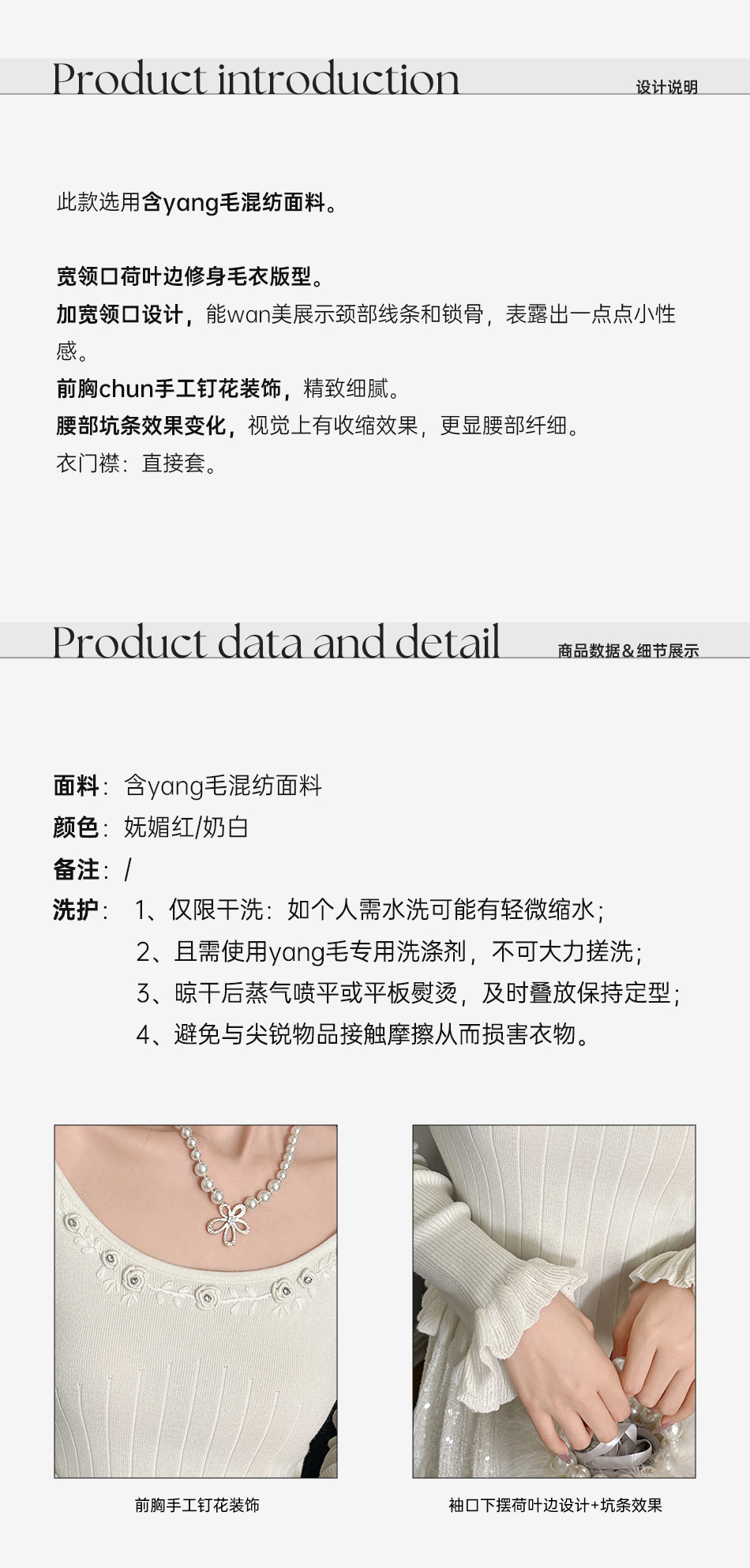 余潇潇红人上新【玫瑰花月】早秋上衣轻奢宽领口荷叶边修身毛衣