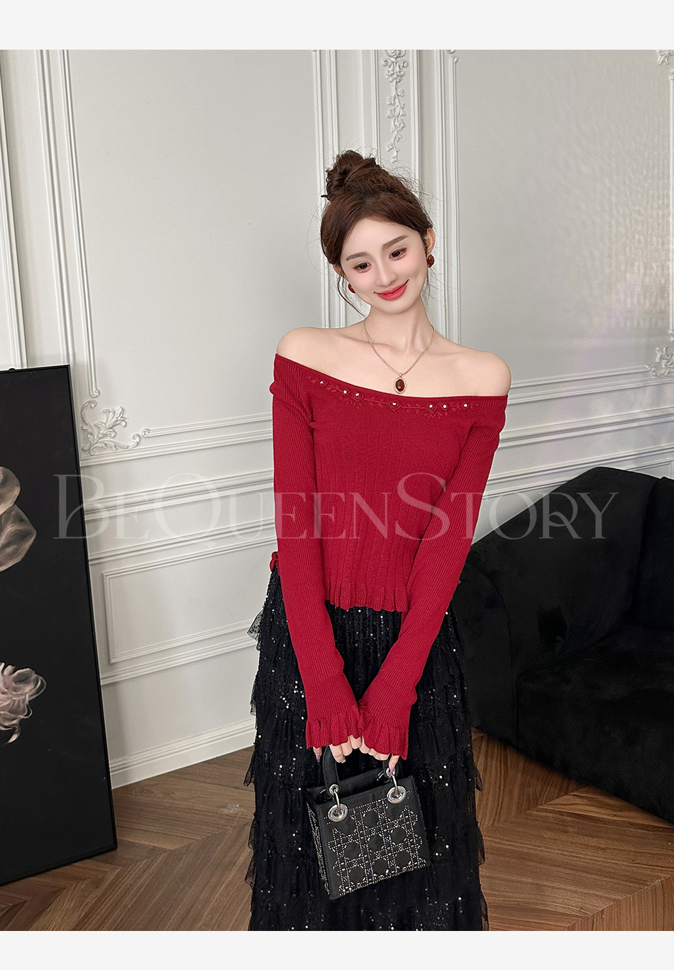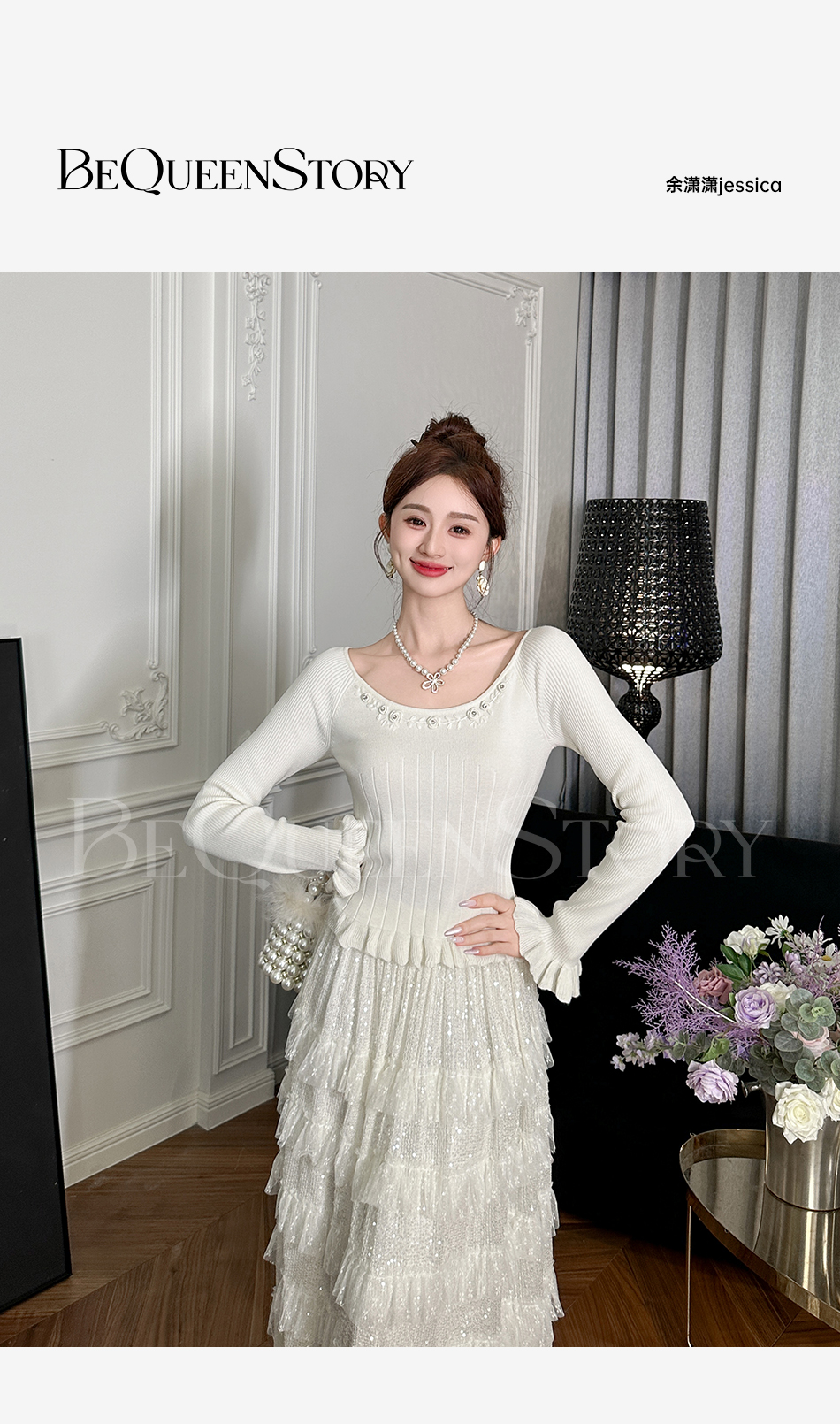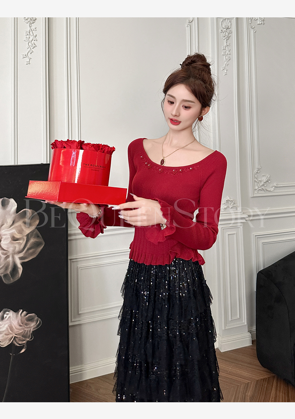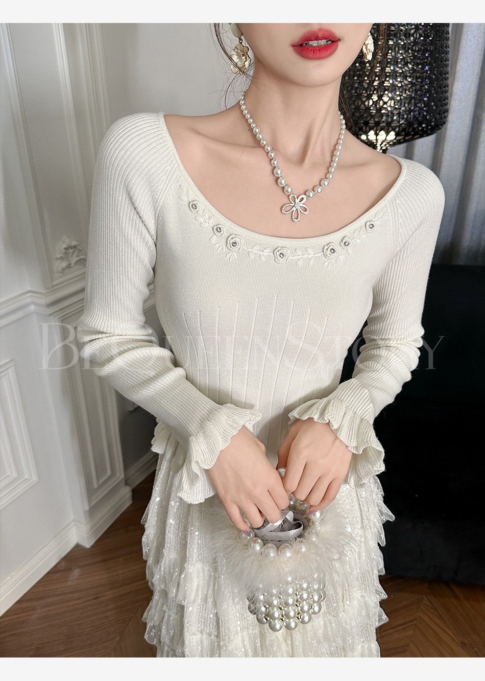 余潇潇红人上新【玫瑰花月】早秋上衣轻奢宽领口荷叶边修身毛衣