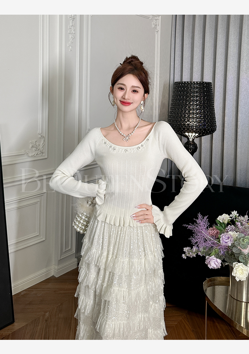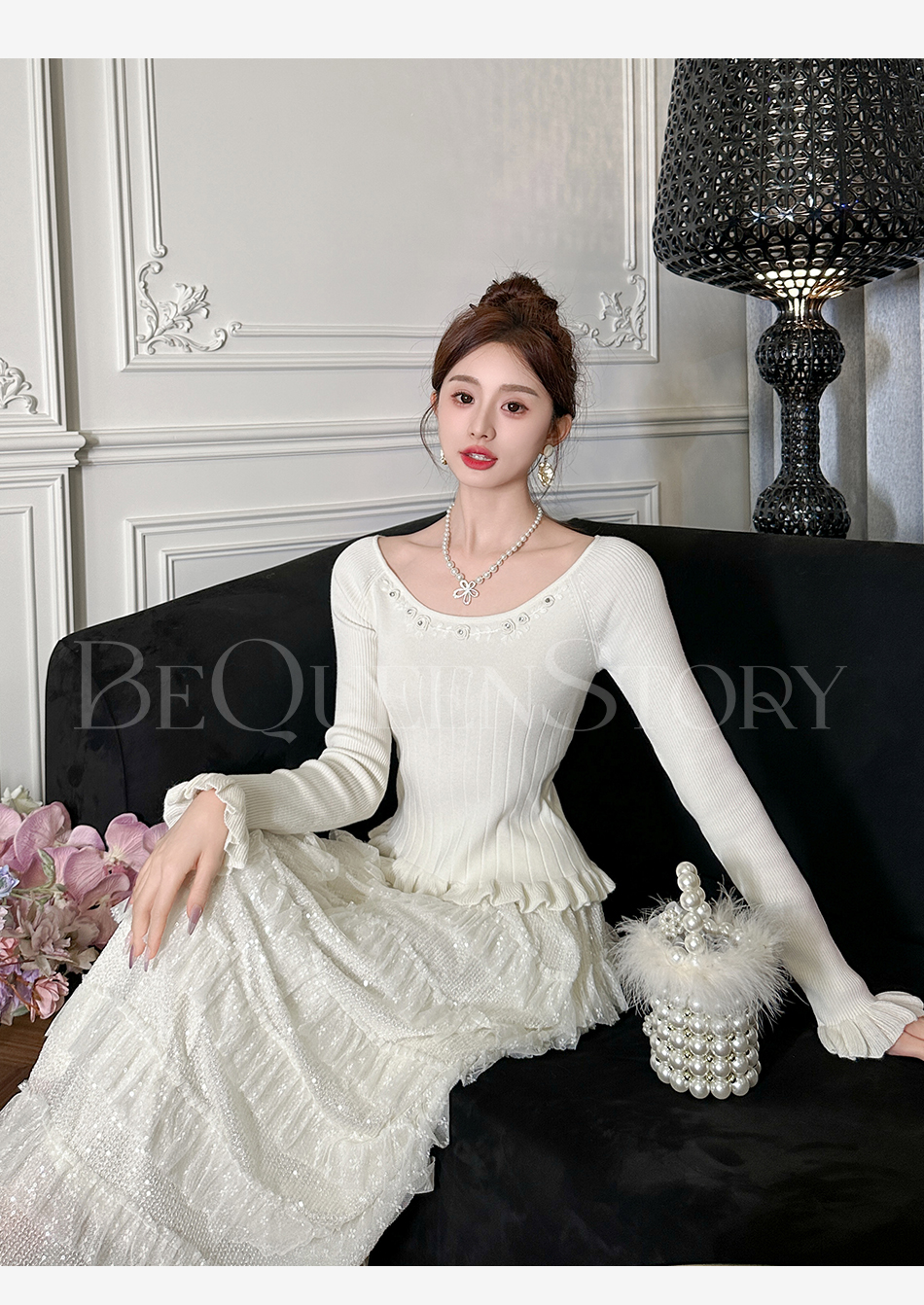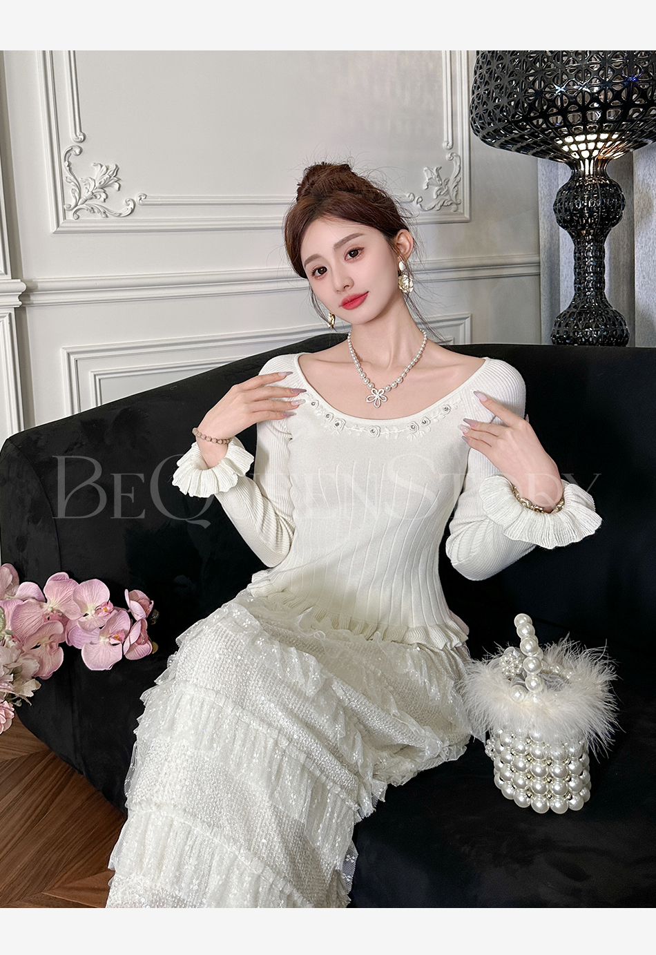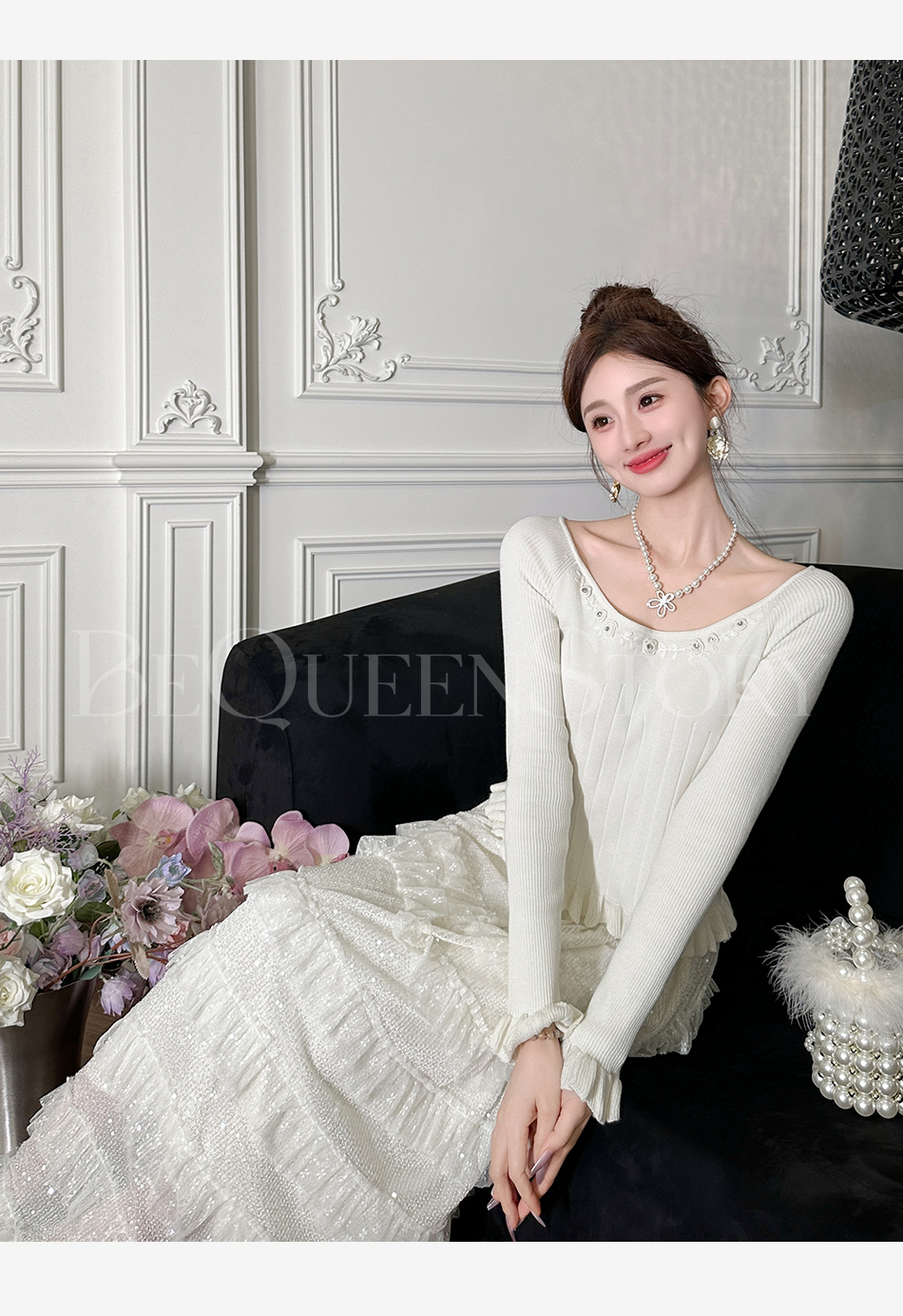 余潇潇红人上新【玫瑰花月】早秋上衣轻奢宽领口荷叶边修身毛衣