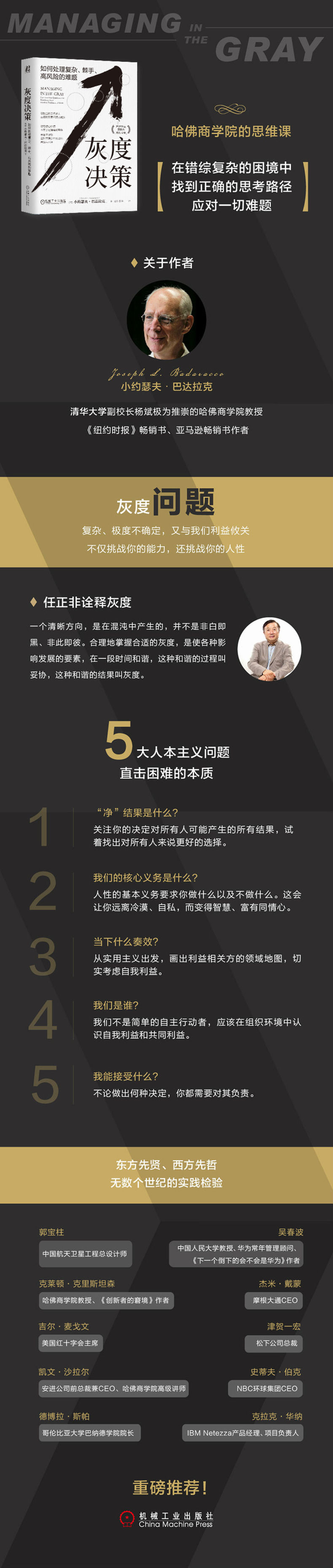 现实中,非黑即白的问题少之又少,大多数问题都处在“灰色地带”,你在生活和工作中背负的责任越大,可能面临的灰度问题就越多。灰度问题棘手、复杂却至关重要。尽管我们搜集量化信息,咨询专家建议,认真分析研判,但这些常规方法似乎都不再奏效。