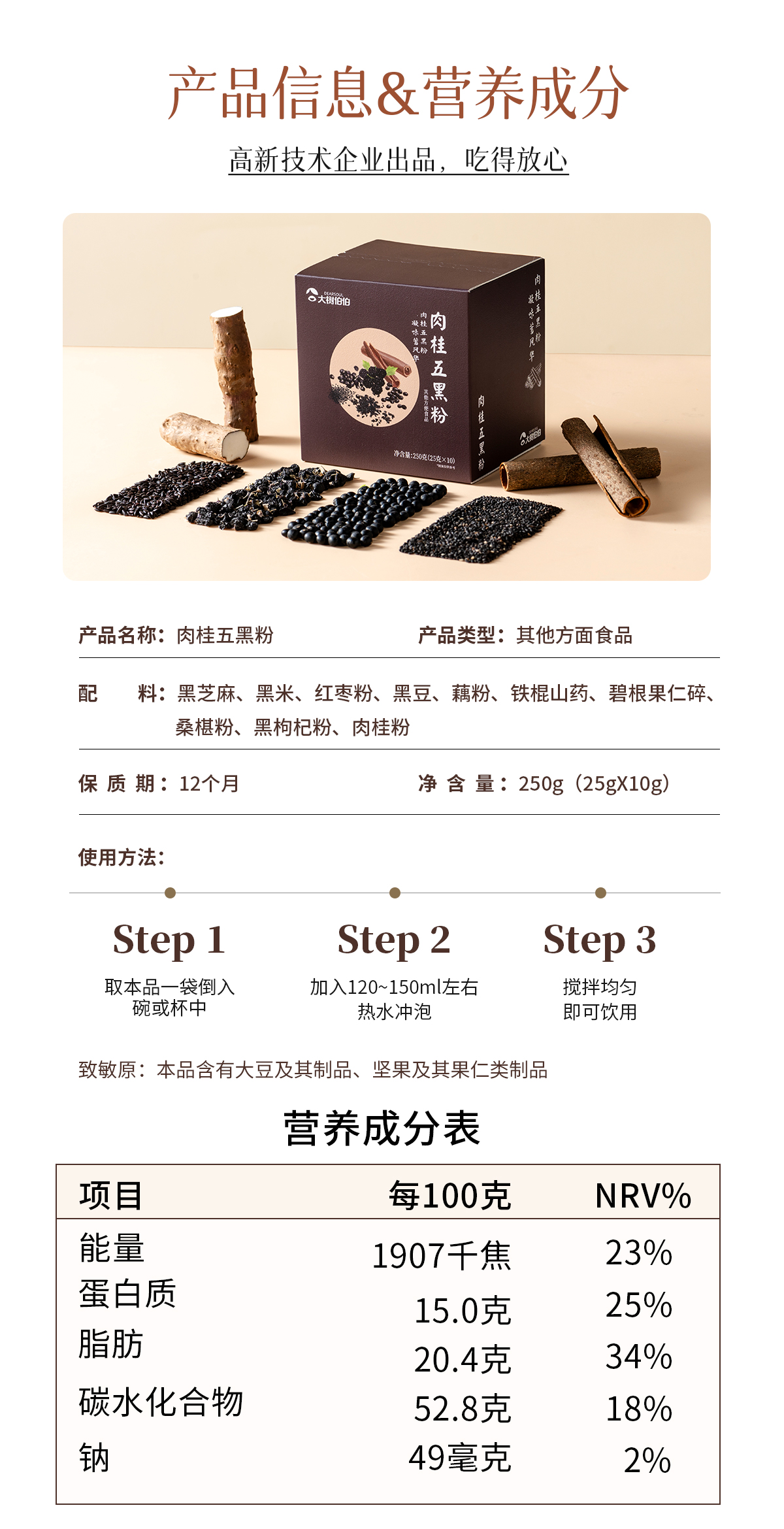 大树伯伯 肉桂五黑粉 黑芝麻碧根果山药 早餐代餐(25g*10袋)250g/盒