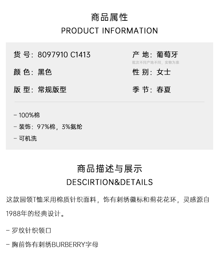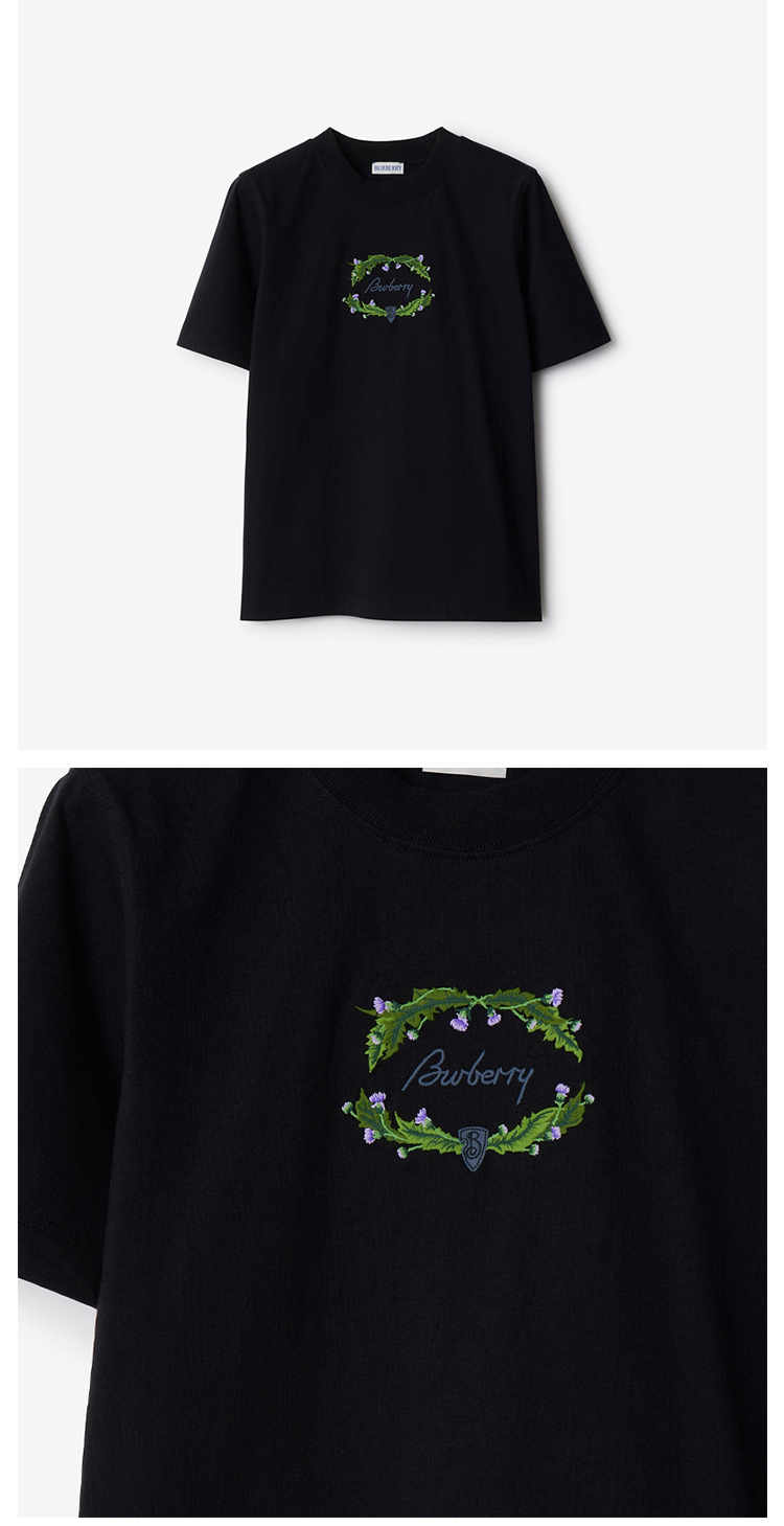【一】BURBERRY 巴宝莉 女士蓟花图案徽标棉质圆领短袖T恤 黑色 8097910 C1413