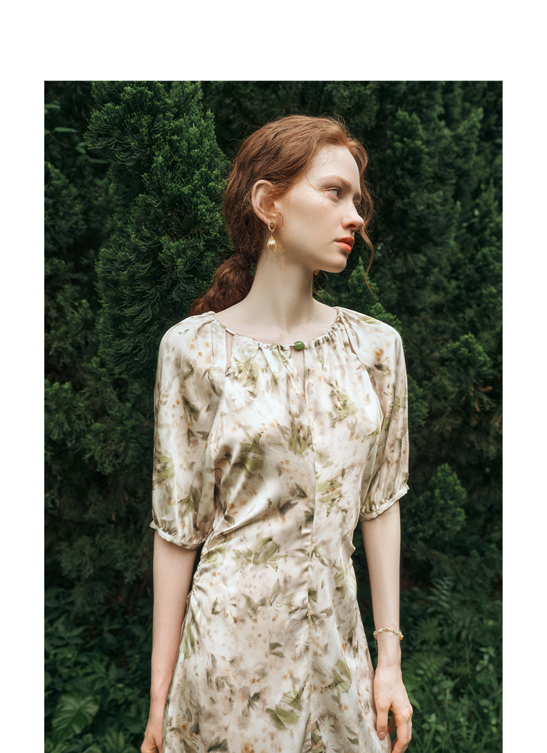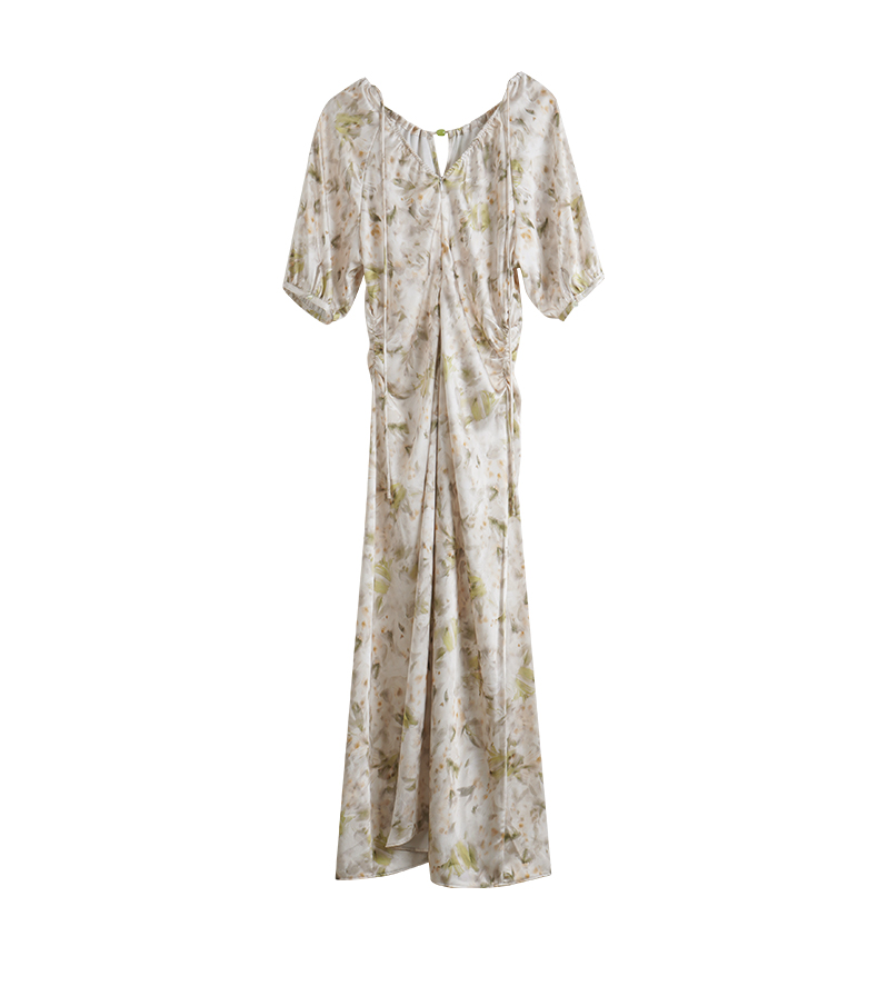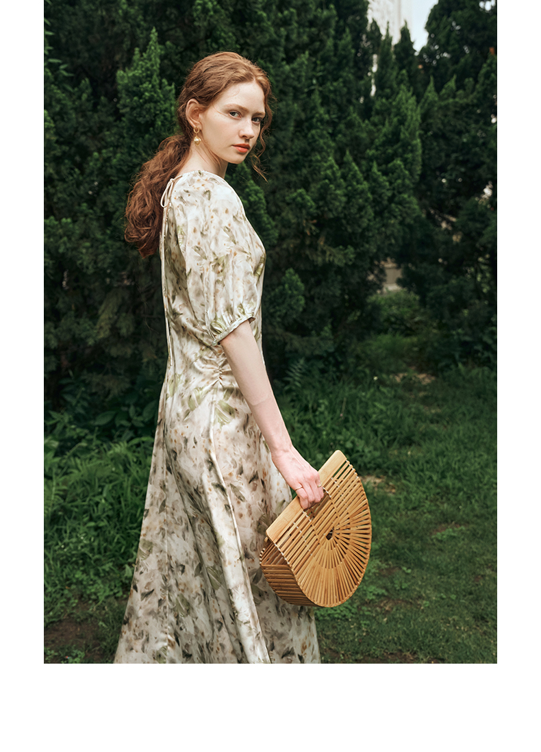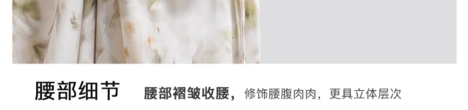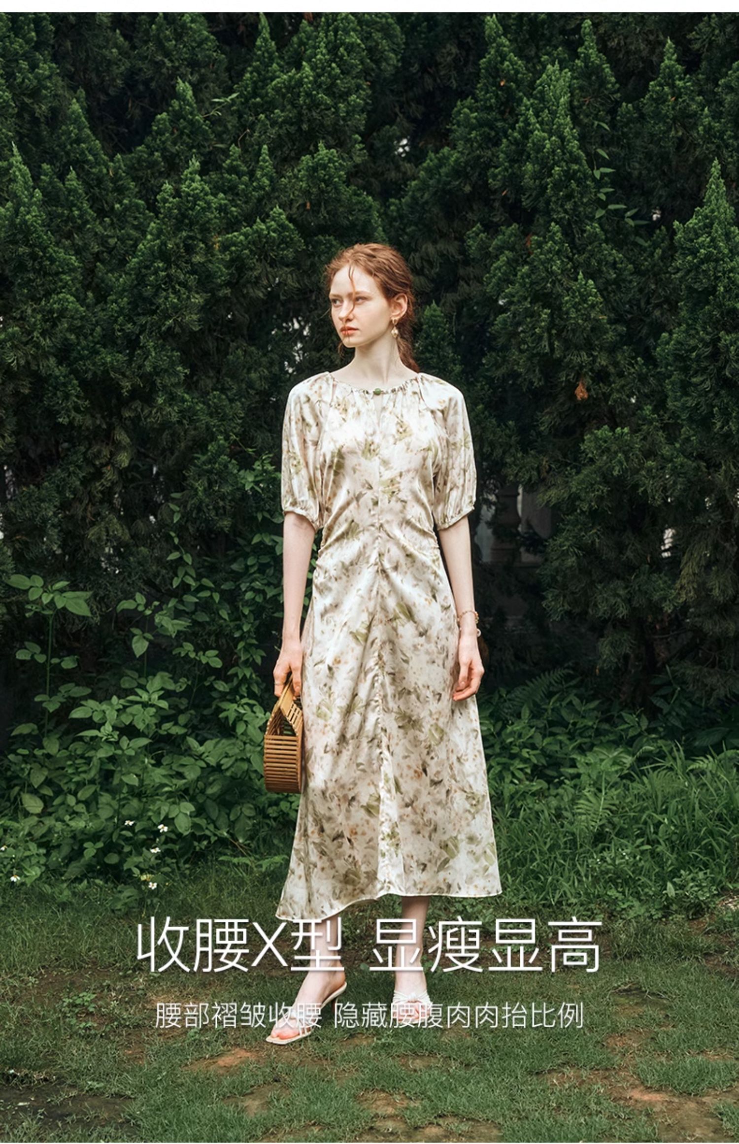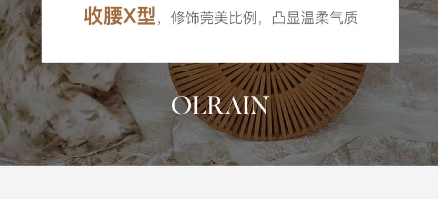 OLrain欧芮儿法式复古缎面碎花连衣裙女夏2024新款褶皱收腰长裙