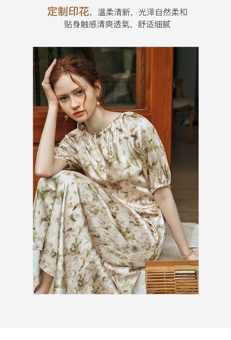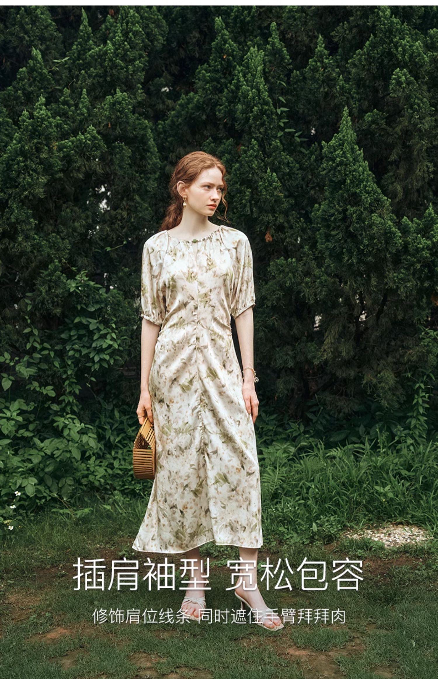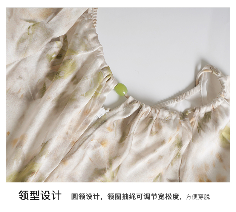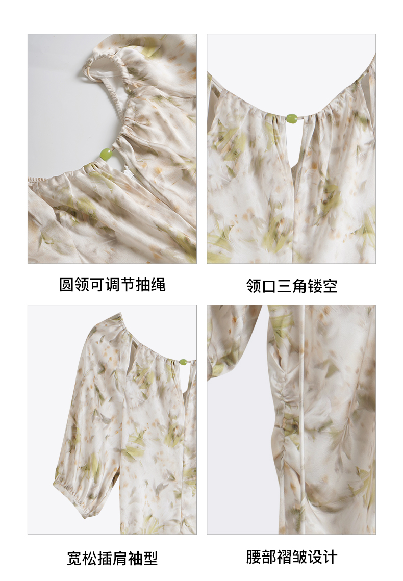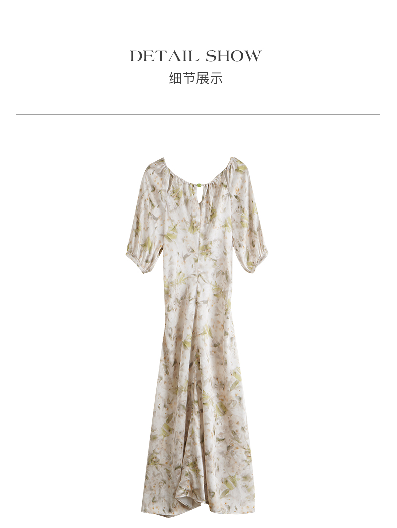 OLrain欧芮儿法式复古缎面碎花连衣裙女夏2024新款褶皱收腰长裙