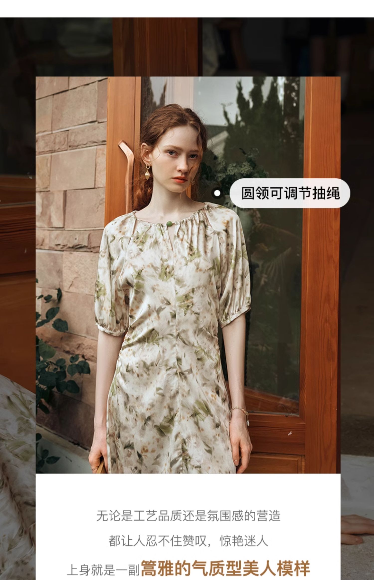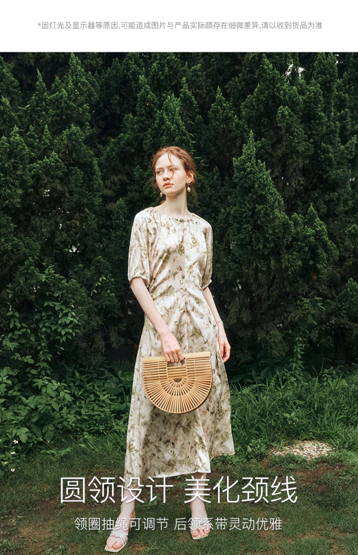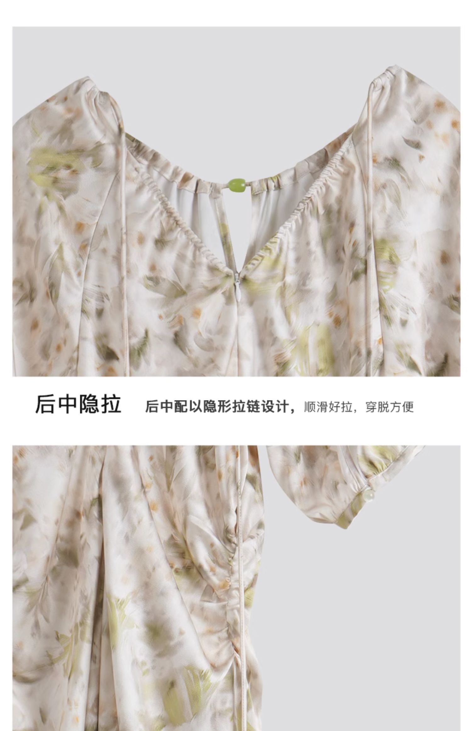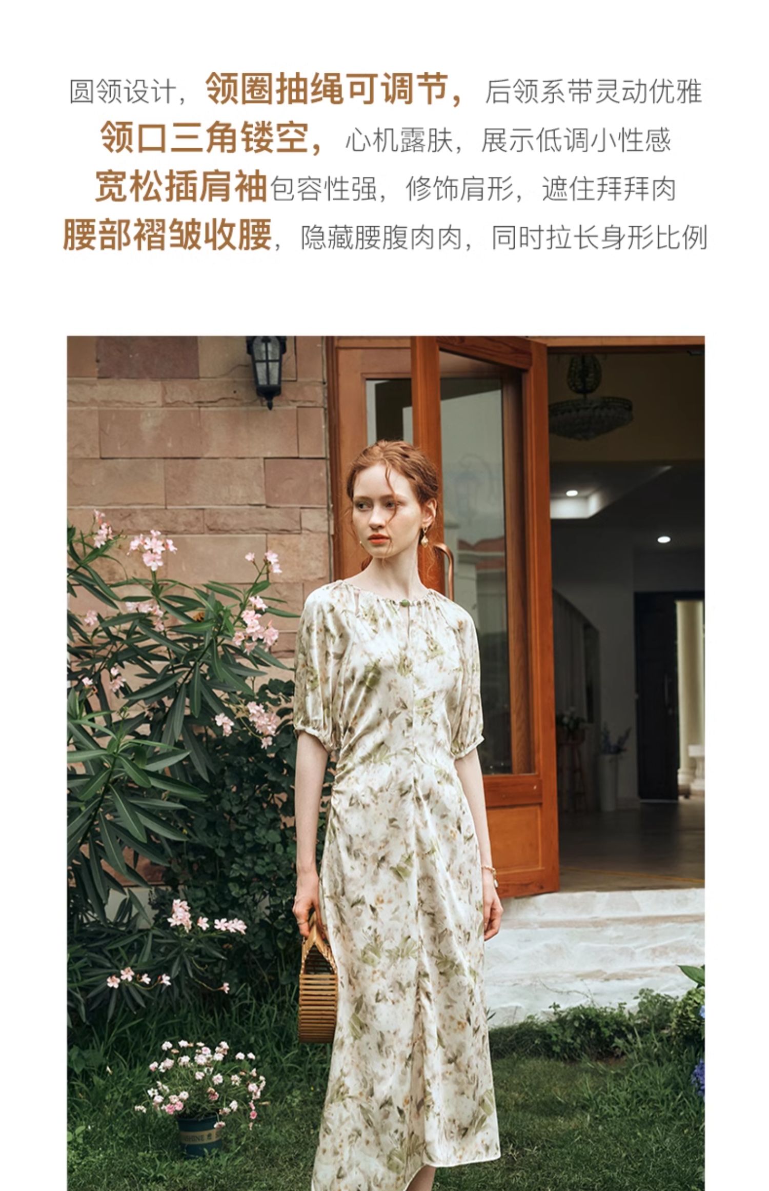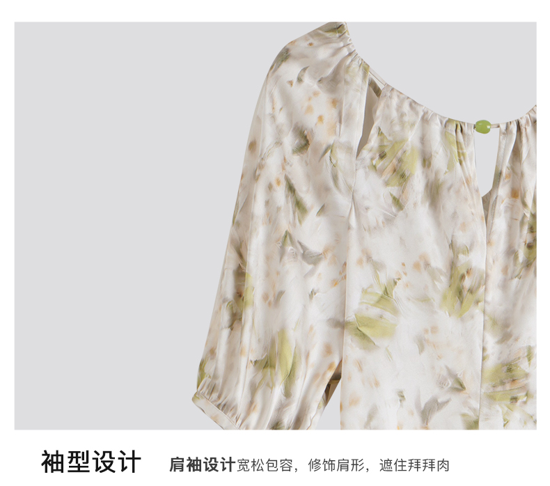 OLrain欧芮儿法式复古缎面碎花连衣裙女夏2024新款褶皱收腰长裙