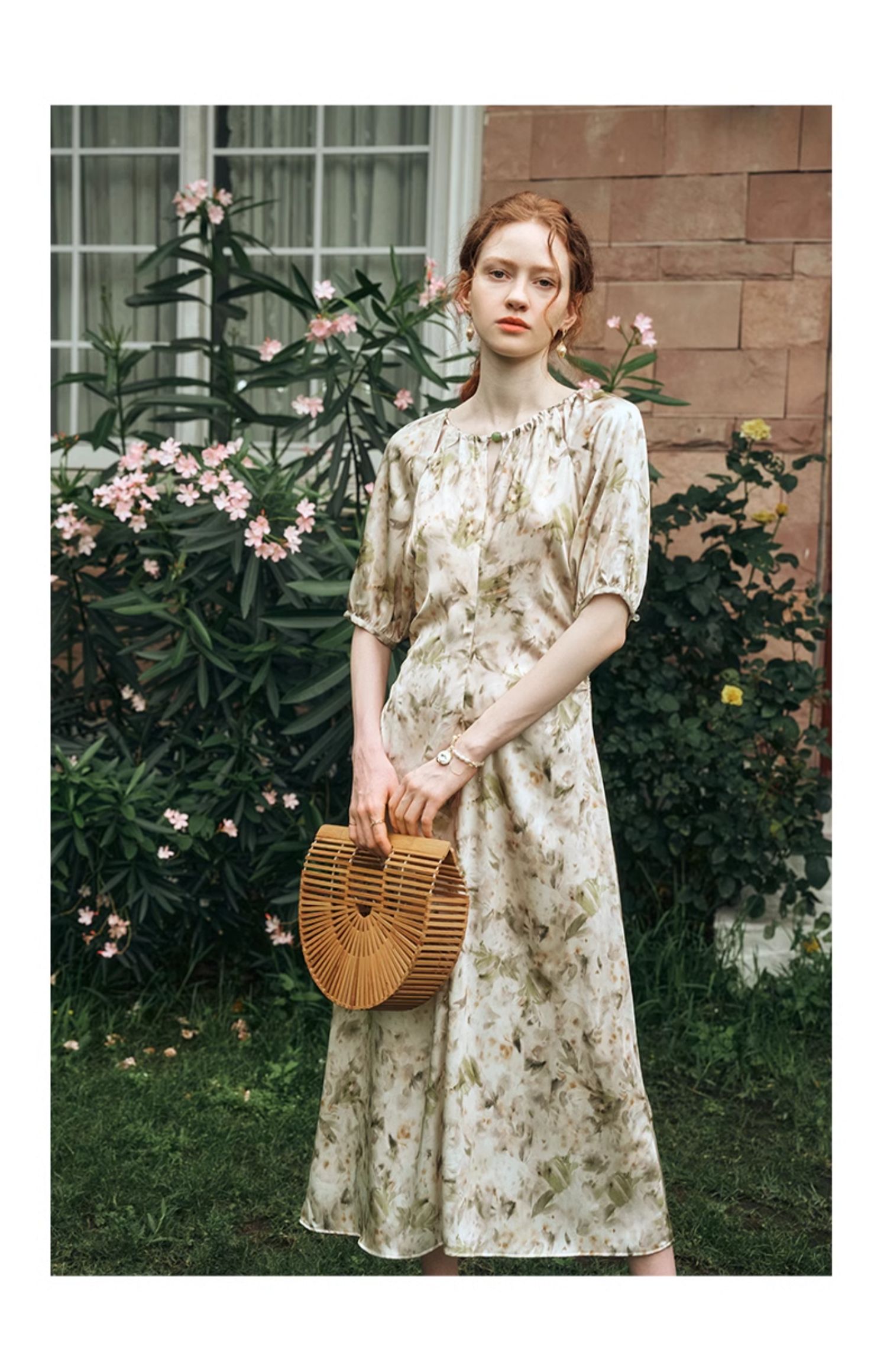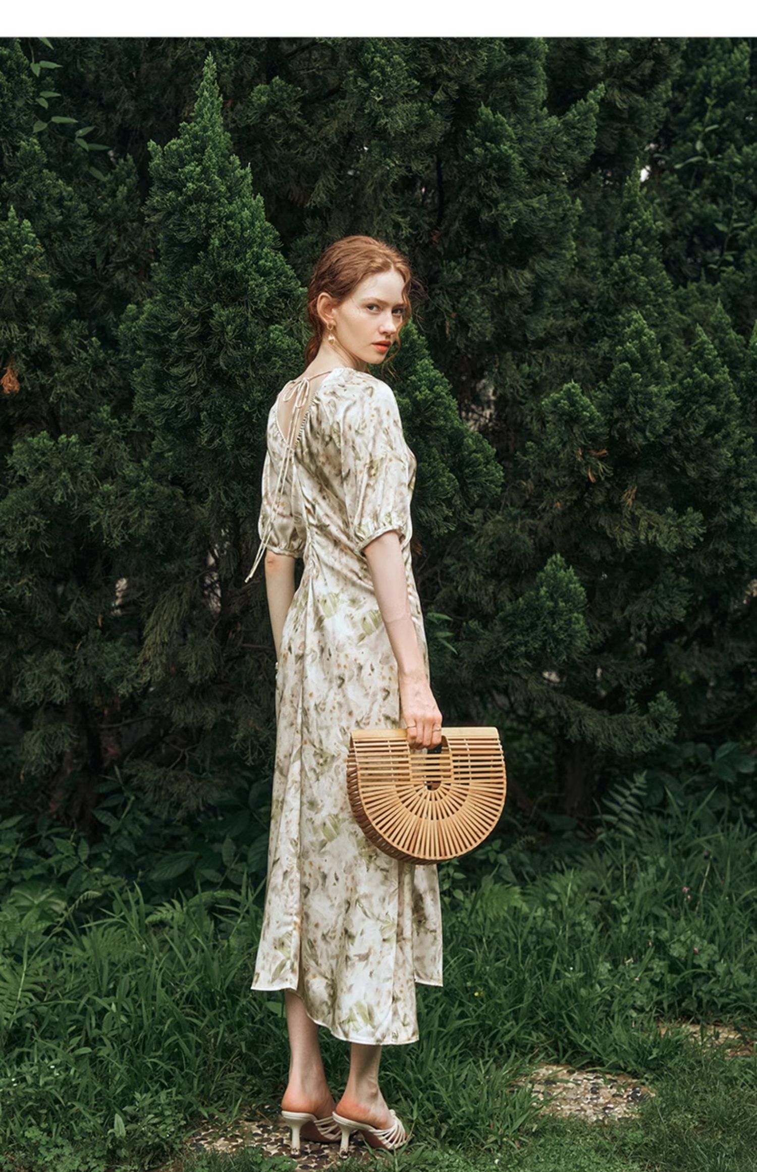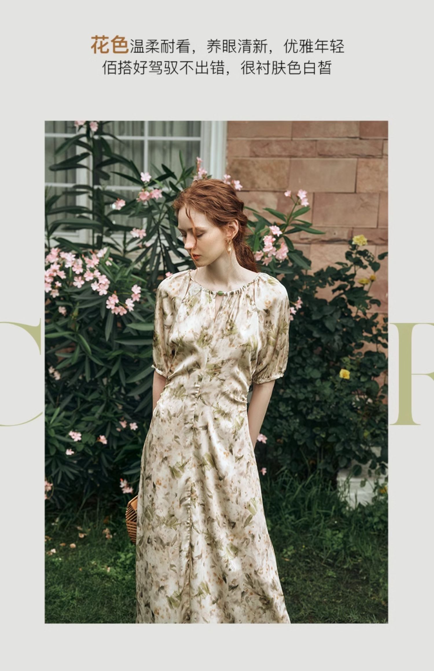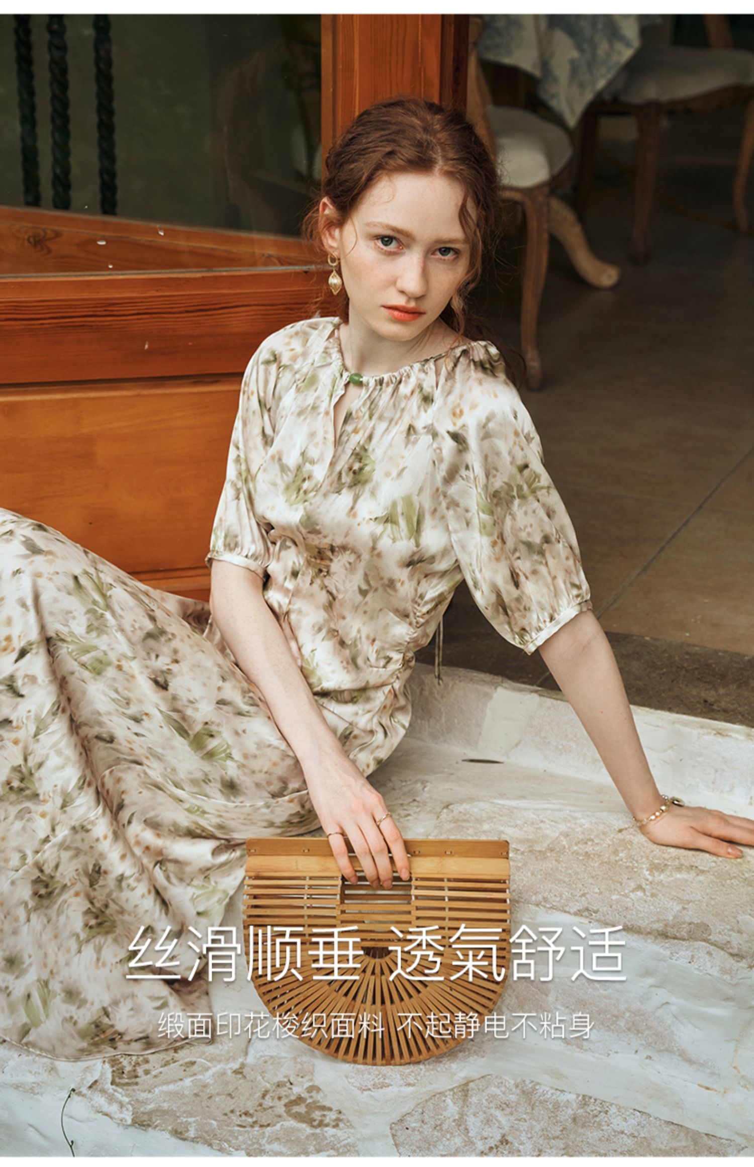 OLrain欧芮儿法式复古缎面碎花连衣裙女夏2024新款褶皱收腰长裙