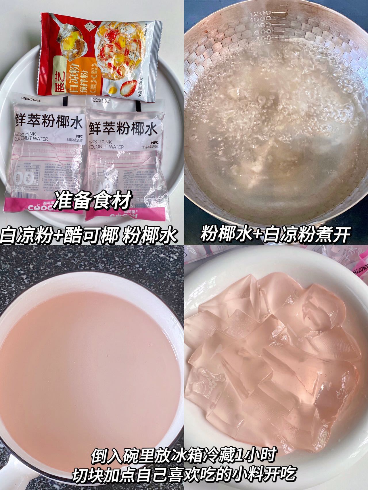 粉椰水+白凉粉煮开,倒入容器里冷藏1小时,