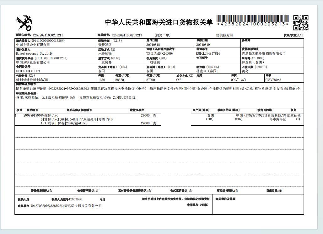 条货柜规模,近 2000吨椰肉果脯冻干原料,10000吨香椰水原料