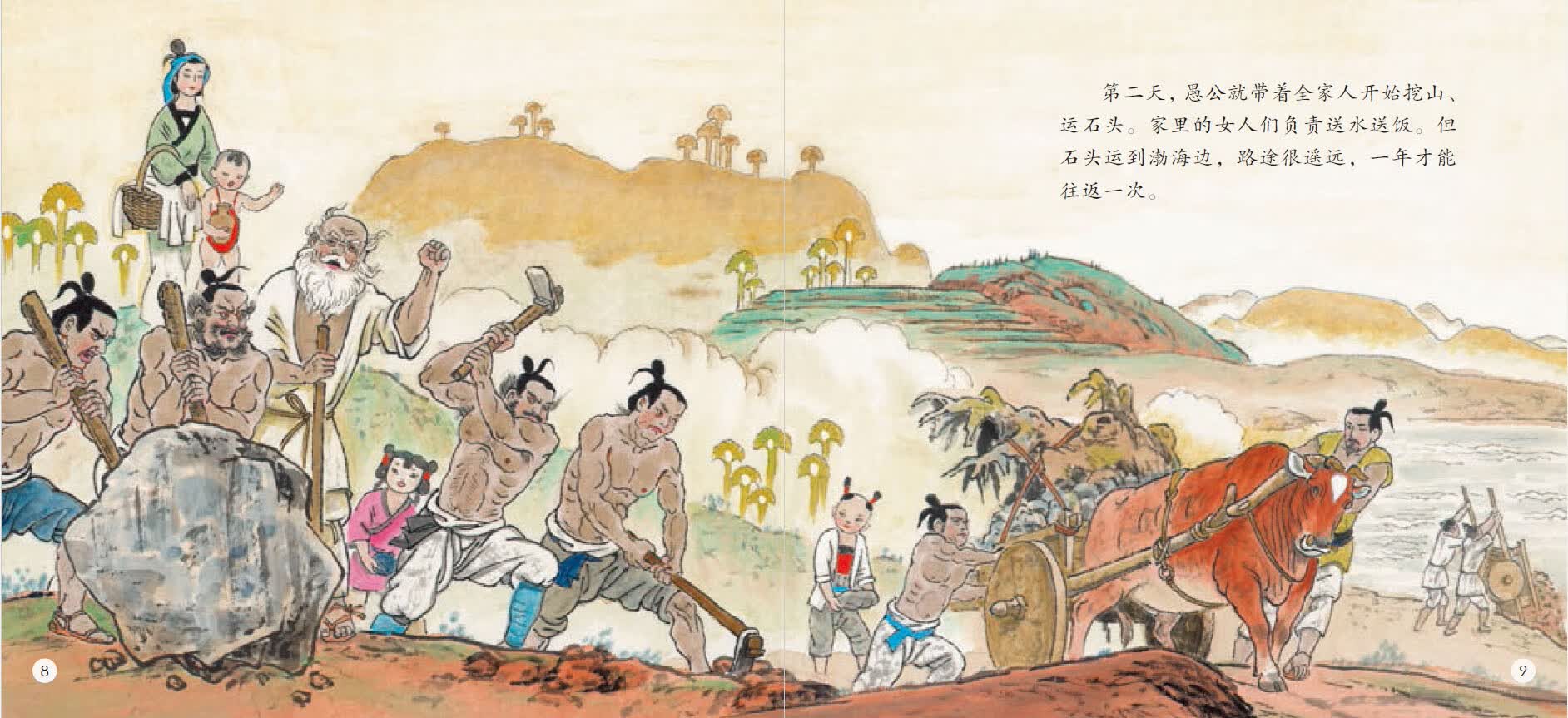 《愚公移山》:愚公苦于家门前的大山阻塞了人们出行,便带领子孙移山开路。愚公的诚意感动了上天,天帝派山神将大山移走,人们从此安居乐业。