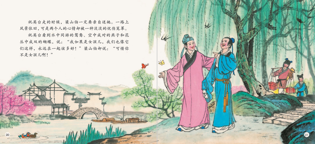 《梁山伯与祝英台》:祝英台巧扮男装求学,与梁山伯相爱。二人亲事遭祝家反对。梁山伯伤心患病去世。祝英台在被逼出嫁途中跳进梁山伯的坟墓。梁、祝二人化为一对蝴蝶比翼双飞。