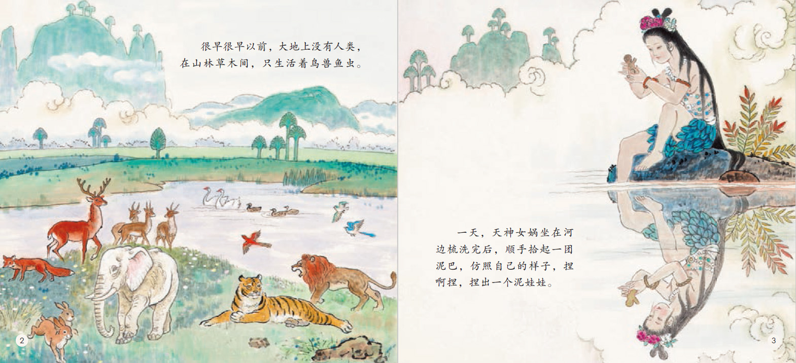 女娲补天》:女娲抟土造人,化生万物。水神共工被火神祝融打败,撞毁不周山,给人类带来灾难。女娲炼制五色石补上了天的漏洞,被称为大地之母。