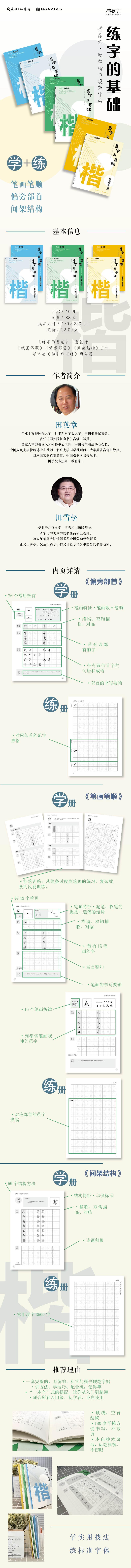 《练字的基础》一套三本包括《基本笔画》《偏旁部首》《间架结构》,每一本又分为《学》和《练》两小册,全书从笔画、部首、结构三个方面对练字进行详细的讲解,内容包括单个字的字形讲解、笔顺、结构、书写要点等介绍,并做范字的描红、双勾和对临练习,加深对字的书写理解,同时在每一页还有诗词、名言警句的举例。全书的字体编排以田字格描临为主,对临为辅,帮助读者书写规范。对应的练字册有笔画范字表、偏旁部首范字表、高频汉字表。可以说是集学与练为一体的实用型字帖。