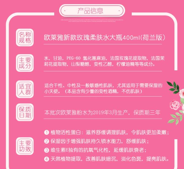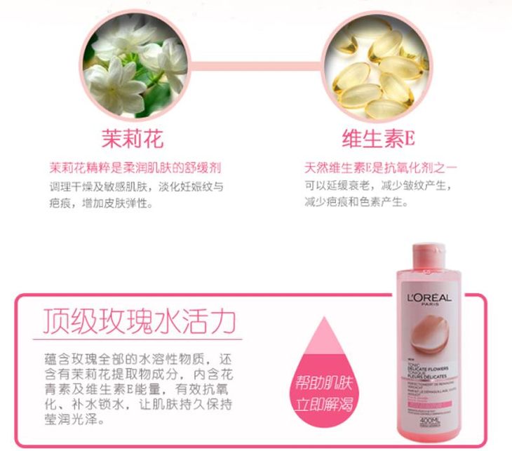 【香港直邮】法国欧莱雅 L'oreal 玫瑰茉莉柔肤水爽肤水粉水荷兰版400ml
