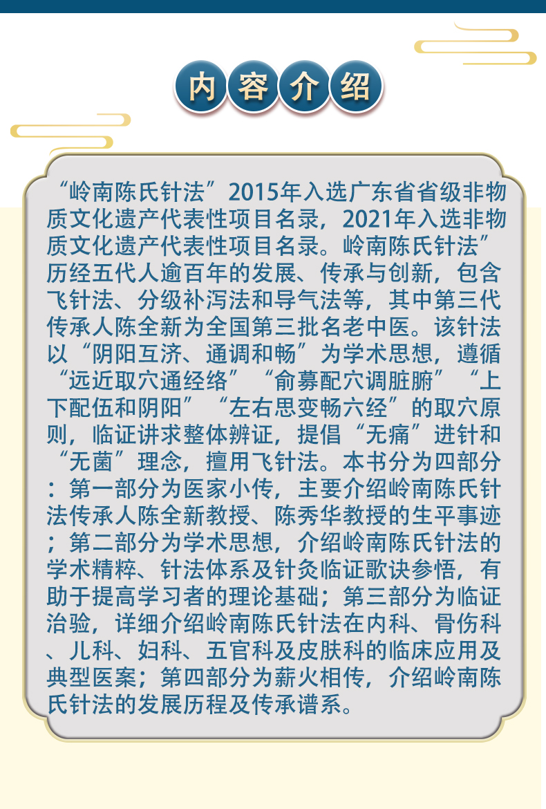 岭南陈氏针法学术思想与临证治验 陈秀华 介绍岭南陈氏针法在内科骨伤科儿妇五官科及皮肤科的临床应用及典型医案 人民卫生出版社