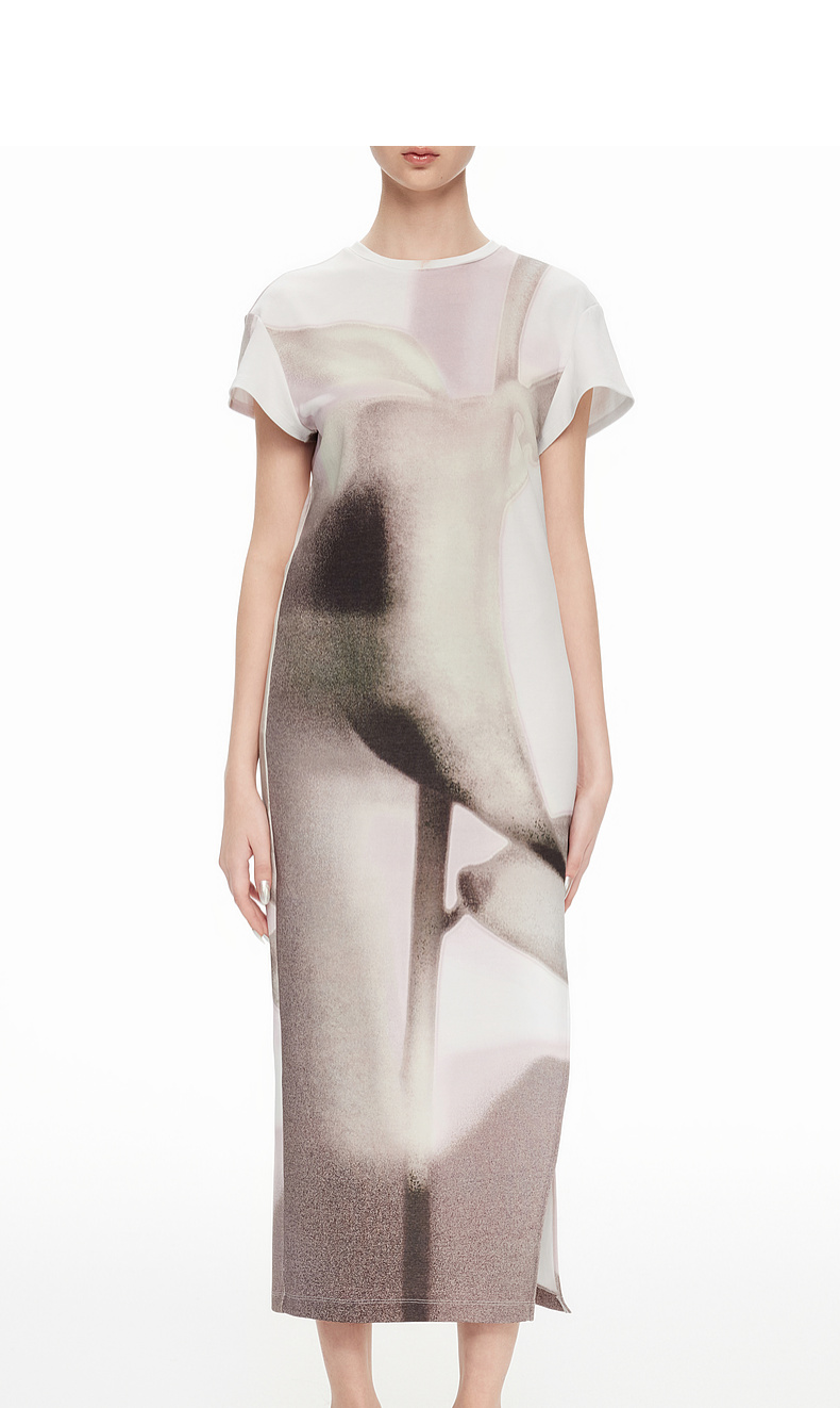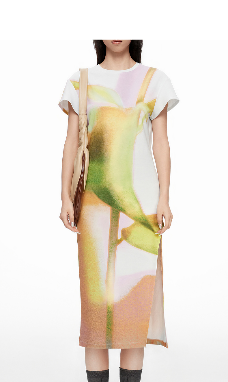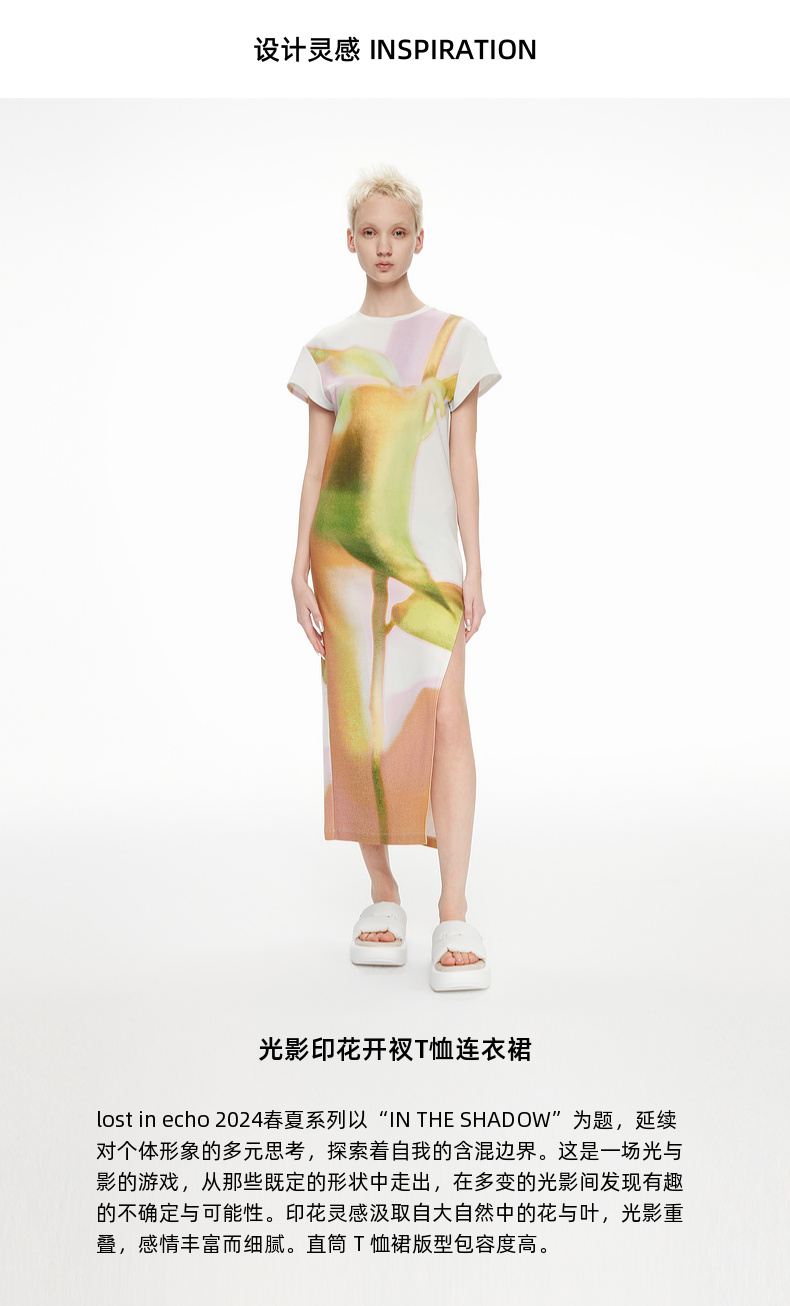 lost in echo2024春夏新品设计师品牌光影印花开衩宽松T恤连衣裙